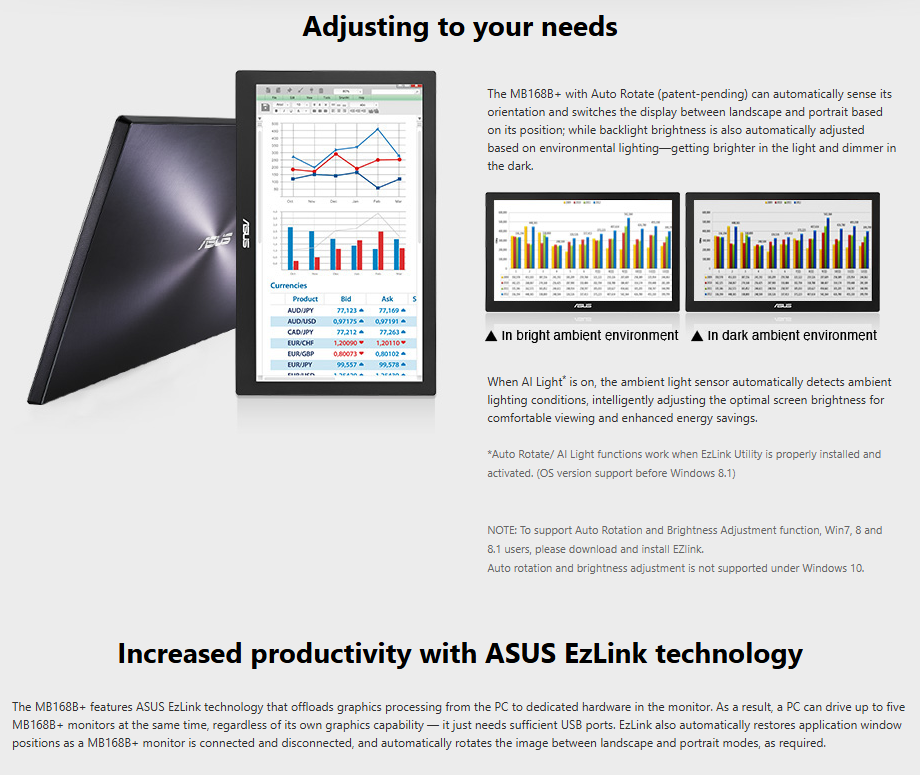 MB168B+ có khả năng tự động điều chỉnh độ sáng dựa trên điều kiện ánh sáng môi trường xung quanh và tùy thuộc vào nguồn điện cung cấp từ laptop. Điều này giúp bảo vệ mắt người dùng và tối ưu hóa thời lượng pin cho chiếc máy tính xách tay của bạn.