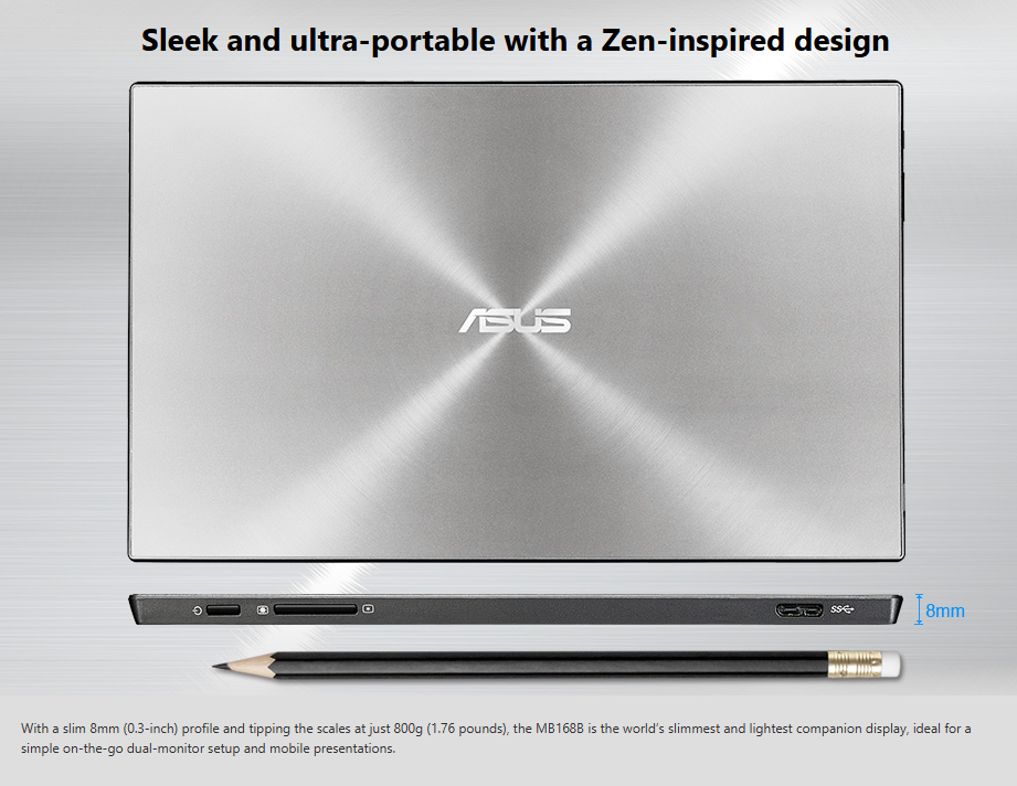 Màn hình Asus ZenScreen MB168B là dòng màn hình di động mang tính biểu tượng, mở đầu cho kỷ nguyên làm việc đa màn hình mọi lúc mọi nơi. Với triết lý thiết kế tối giản, MB168B loại bỏ hoàn toàn sự rườm rà của dây nguồn và cáp tín hiệu truyền thống, thay vào đó là giải pháp một cáp USB duy nhất. Với trọng lượng chỉ ngang một cuốn tạp chí và độ mỏng ấn tượng, đây là sự lựa chọn kinh tế và hiệu quả nhất cho những người dùng văn phòng cần thêm không gian hiển thị trên các dòng laptop phổ thông.