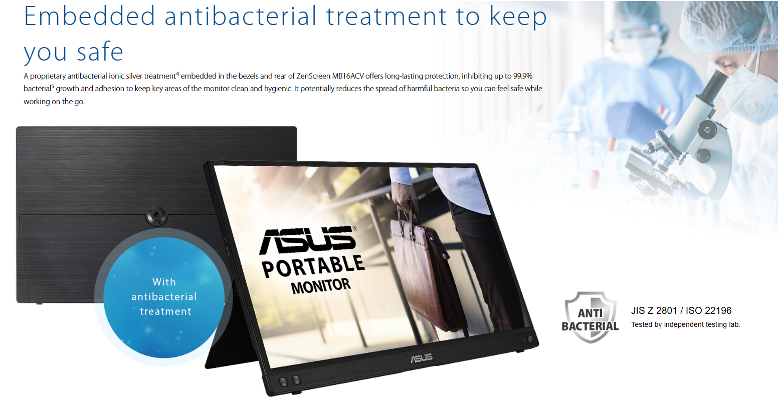 Trong môi trường làm việc di động (quán cà phê, sân bay), vi khuẩn dễ dàng bám vào các thiết bị. MB16ACV được xử lý bằng ion bạc kháng khuẩn đã qua kiểm nghiệm ISO 22196, giúp ức chế tới 99% sự phát triển của vi khuẩn, giữ cho bề mặt màn hình luôn sạch sẽ và an toàn cho người sử dụng.