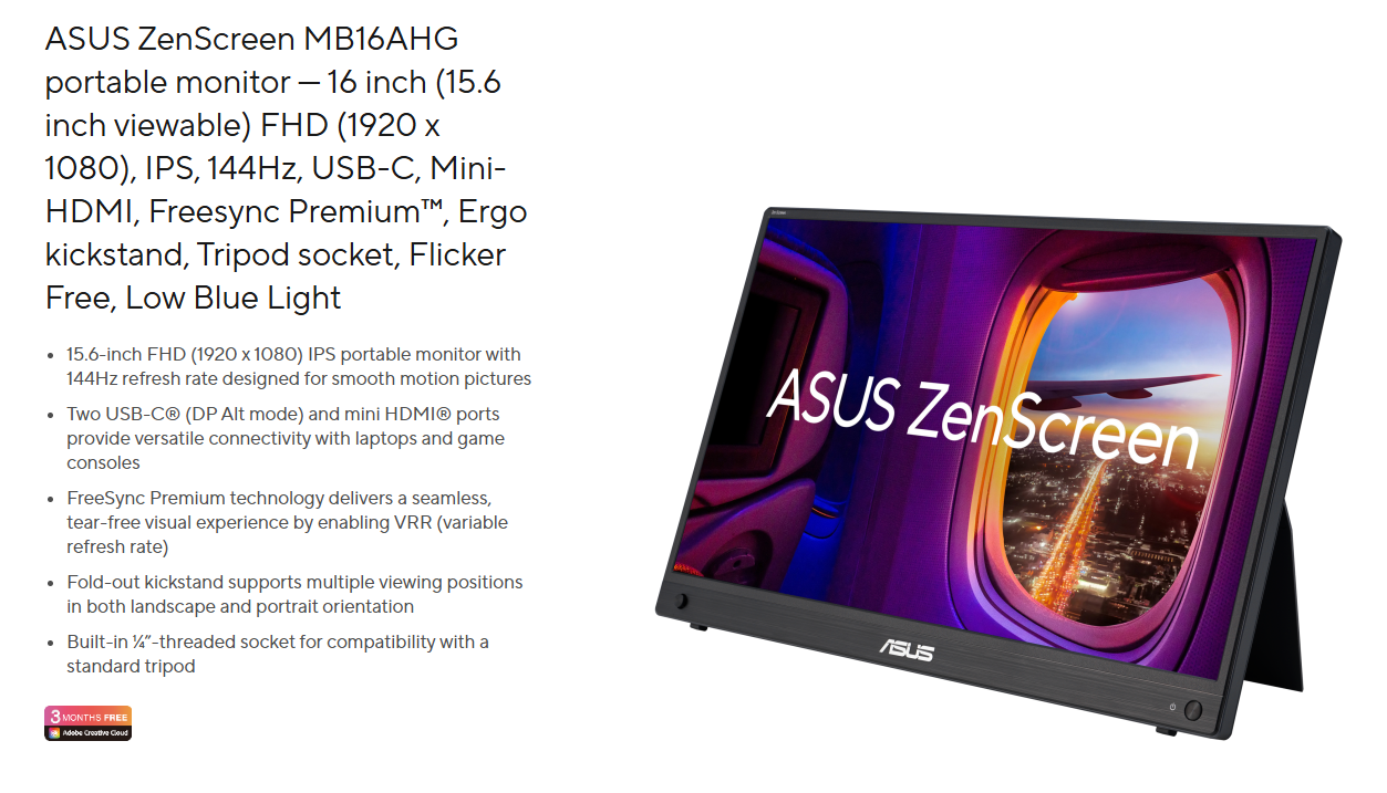 Màn hình Asus ZenScreen MB16AHG (15.6 inch/144Hz/FHD/IPS)