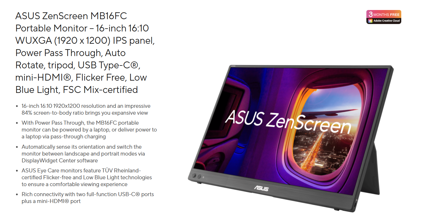 Asus ZenScreen MB16FC là sự cân bằng tuyệt vời giữa kích thước hiển thị rộng rãi và tính di động linh hoạt. Với độ phân giải WUXGA sắc nét và tốc độ 75Hz mượt mà, đây là phụ kiện đáng giá để nâng cao trải nghiệm làm việc của bạn ở bất cứ đâu.