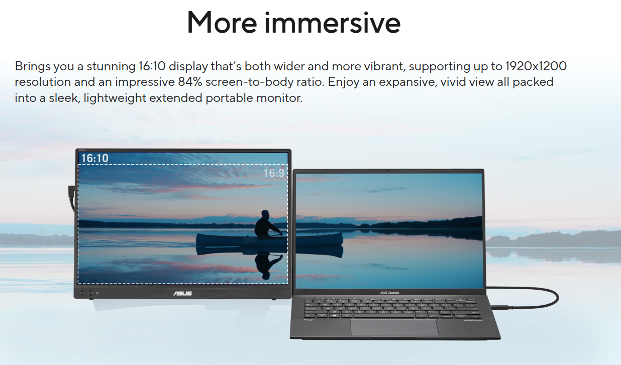 Đúng như tên gọi ZenScreen, MB16FC cực kỳ mỏng và nhẹ, dễ dàng bỏ gọn vào túi chống sốc hoặc balo cùng với Laptop. Lớp hoàn thiện tinh tế mang lại vẻ ngoài chuyên nghiệp, phù hợp với mọi không gian từ văn phòng đến quán cà phê.