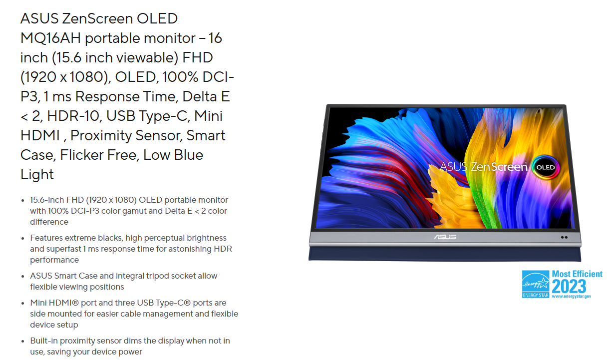 Màn hình Asus ZenScreen OLED MQ16AH (15.6 inch/60Hz/FHD/Oled)