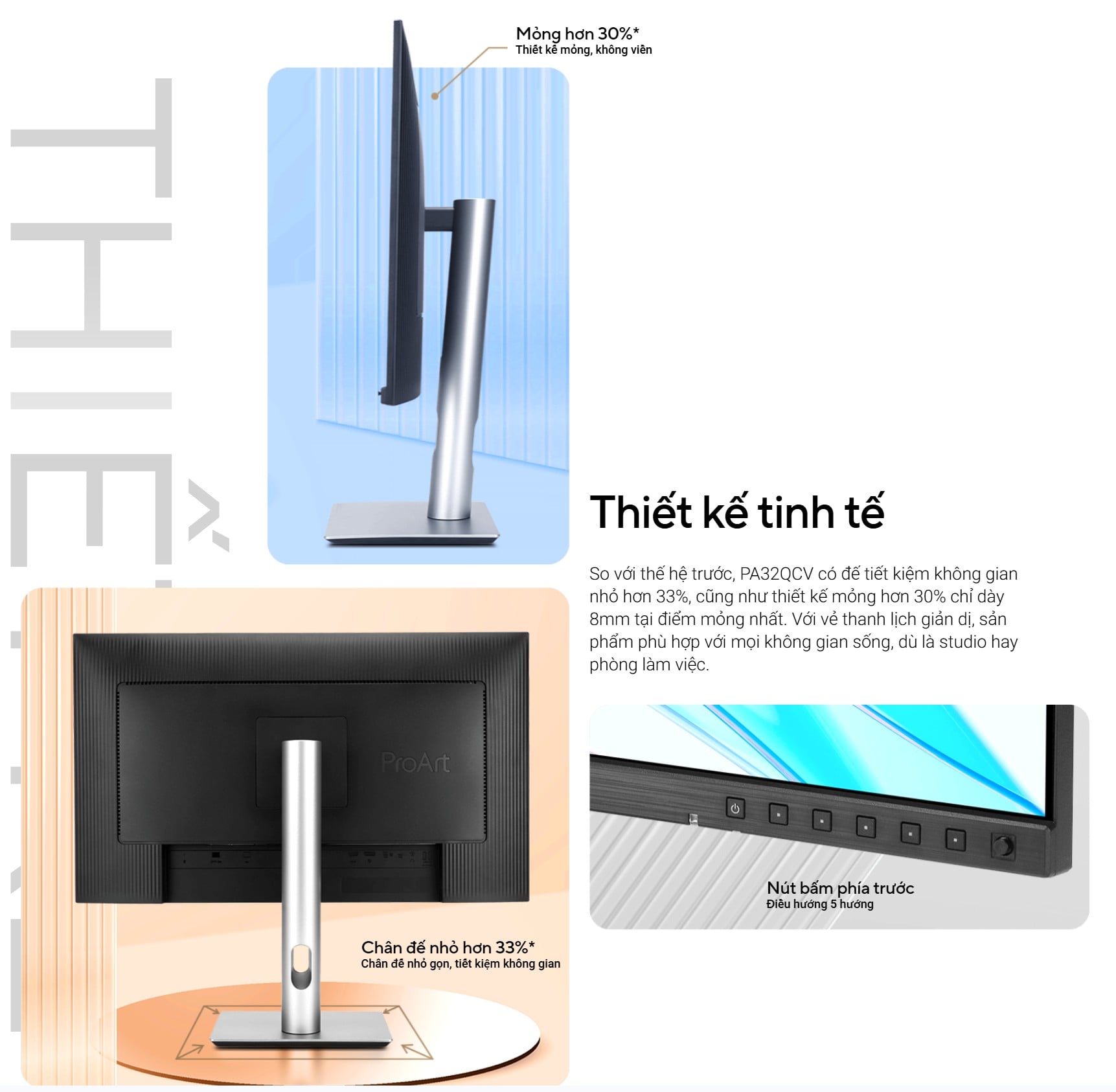 ASUS ProArt Display PA32QCV là lựa chọn hoàn hảo cho chuyên gia sáng tạo nội dung, nhiếp ảnh, hậu kỳ phim và thiết kế đồ họa. Màn hình 6K sắc nét, độ chính xác màu tuyệt đối, khả năng kết nối linh hoạt cùng thiết kế công thái học giúp PA32QCV trở thành trung tâm điều khiển sáng tạo chuyên nghiệp, đáp ứng mọi tiêu chuẩn quốc tế khắt khe.