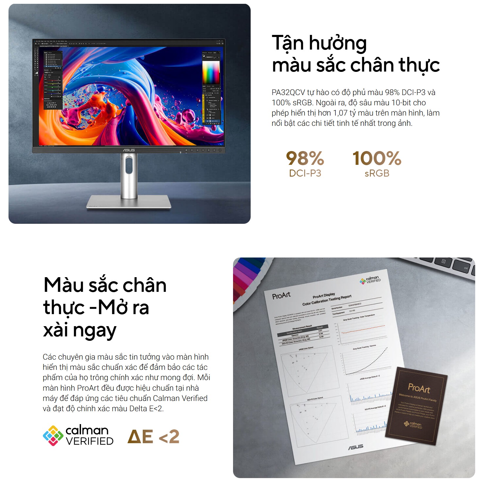 Mỗi màn hình được hiệu chuẩn chuyên nghiệp trước khi xuất xưởng, đảm bảo độ lệch màu (Delta E) dưới 2, mang lại màu sắc chính xác tuyệt đối theo tiêu chuẩn quốc tế. - Dải màu rộng 98% DCI-P3 & 100% sRGB