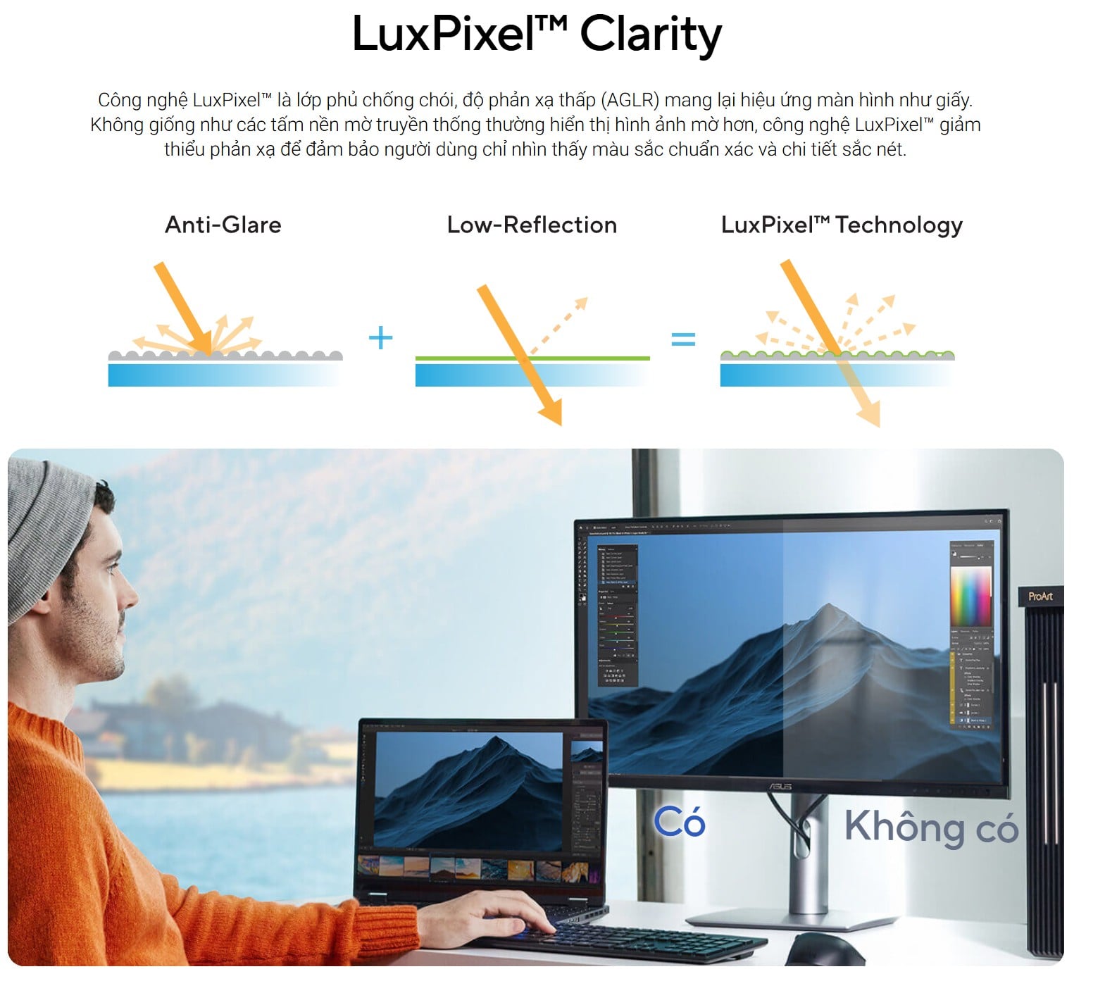 Công nghệ LuxPixel™ Anti-Glare Low Reflection giảm chói và phản xạ, giúp hình ảnh luôn rõ ràng, dễ quan sát ngay cả trong môi trường ánh sáng mạnh. Góc nhìn rộng 178° đảm bảo độ chính xác màu sắc ở mọi góc độ. - Độ chính xác màu ΔE<2 – Được hiệu chuẩn sẵn tại nhà máy