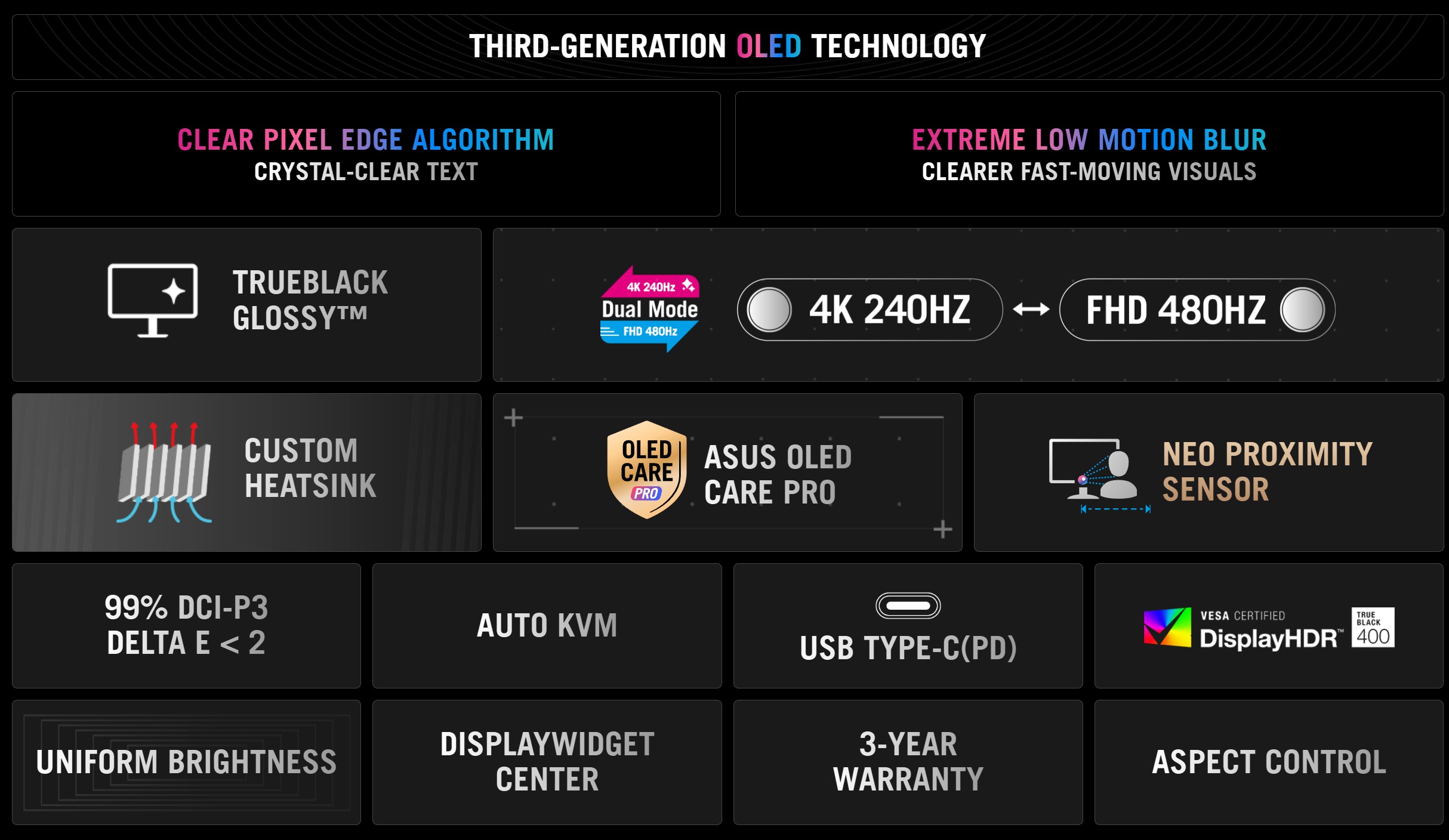 Màn hình tích hợp ASUS OLED Care Pro với Neo Proximity Sensor (Cảm biến tiệm cận mới). Cảm biến này phát hiện khi người dùng rời khỏi màn hình và tự động chuyển sang màn hình đen để giảm nguy cơ lưu ảnh (burn-in), kéo dài tuổi thọ của tấm nền OLED.