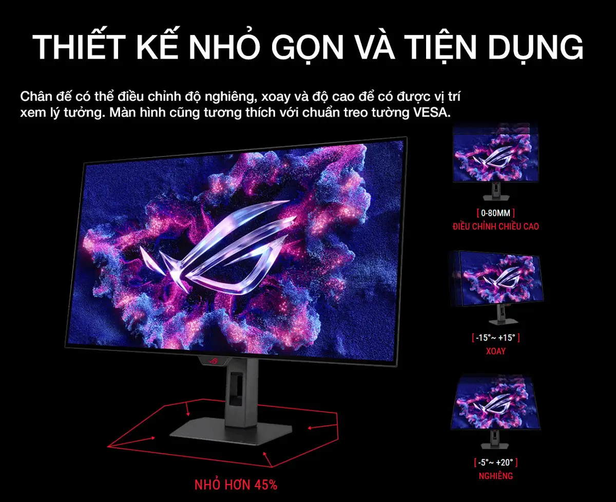 Chân đế cho phép điều chỉnh độ nghiêng (), xoay () và độ cao (), giúp bạn tìm được góc nhìn thoải mái nhất.