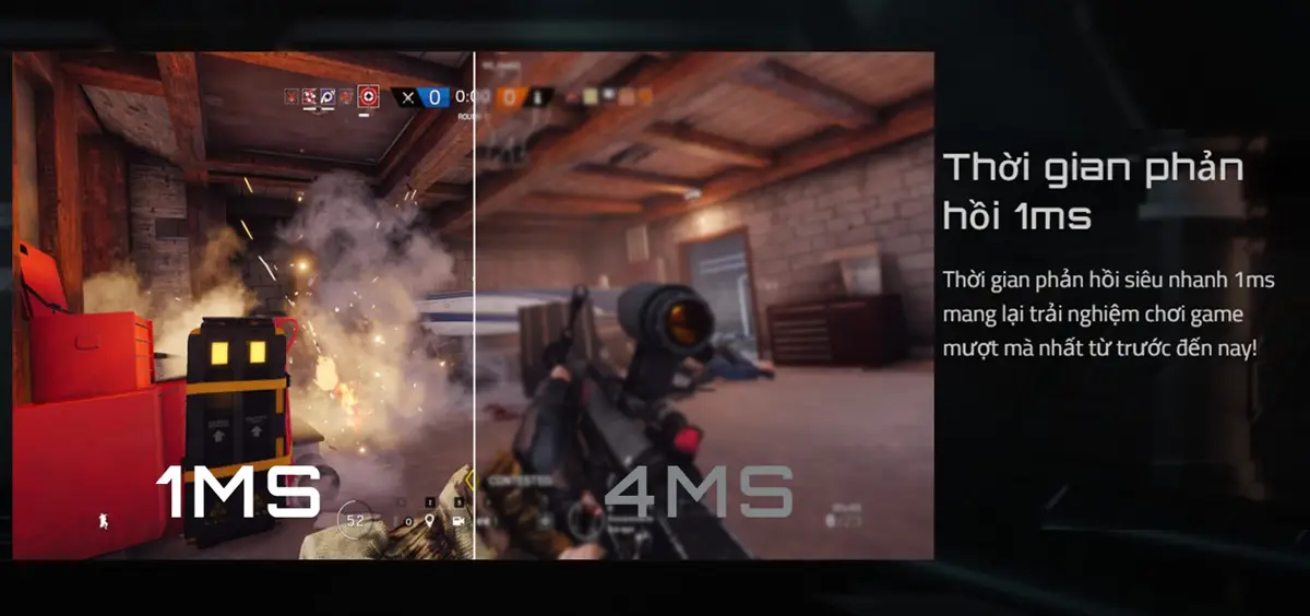 Màn hình có tần số quét 240 Hz và thời gian phản hồi 1ms (GTG), loại bỏ hoàn toàn hiện tượng nhòe chuyển động (motion blur) và ghosting. Tốc độ này đảm bảo hình ảnh siêu mượt mà và sắc nét, mang lại lợi thế phản xạ tức thì trong các tựa game bắn súng hoặc tốc độ cao.