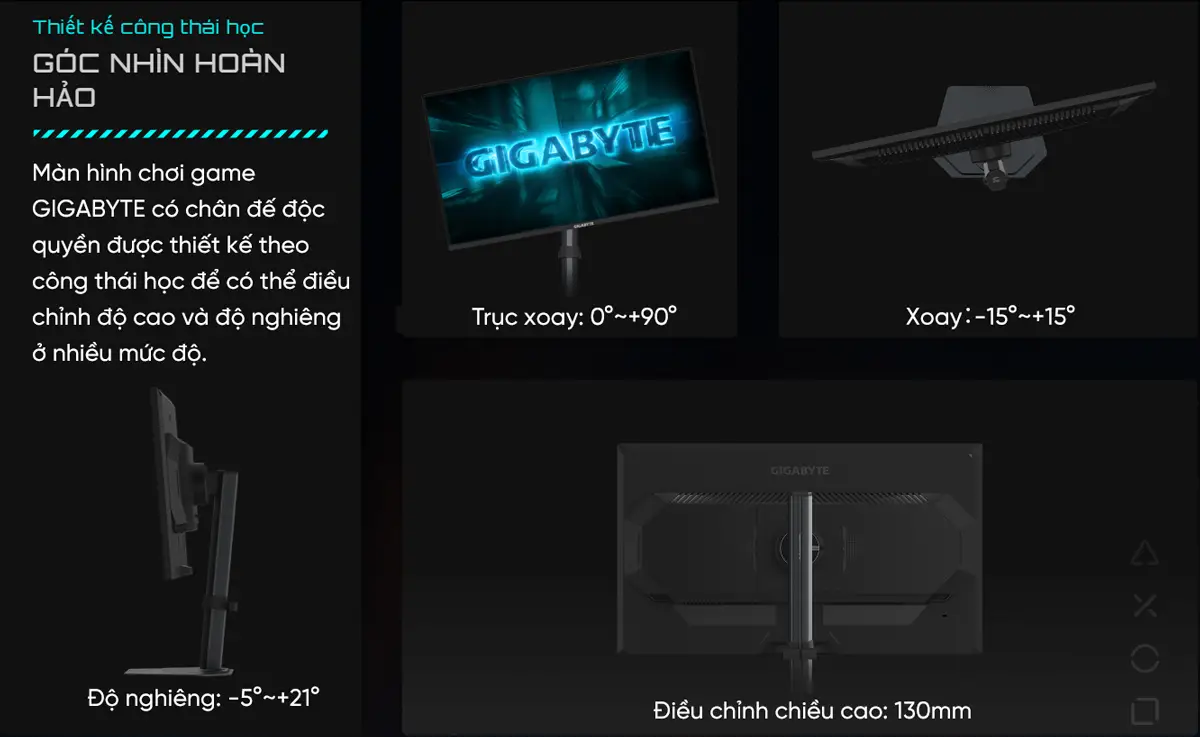 Màn hình tương thích với tiêu chuẩn HDR10, cải thiện độ tương phản và chi tiết hình ảnh ở các vùng sáng và tối. Thiết kế công thái học linh hoạt cho phép điều chỉnh Chiều cao (130mm), Tilt, Swivel, và Pivot (xoay dọc 90°), giúp người dùng dễ dàng tìm được góc nhìn thoải mái nhất khi chơi game hoặc làm việc.