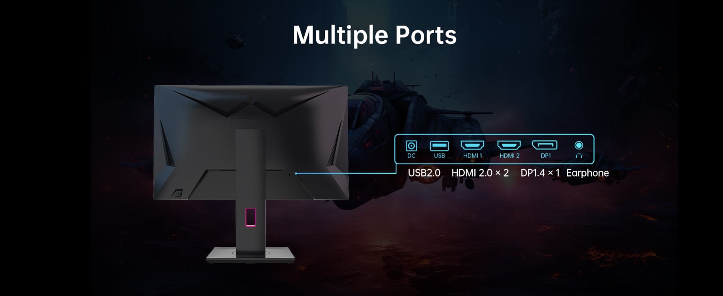 Trang bị 2 cổng HDMI 2.0, 1 cổng DP 1.4, 1 cổng USB 2.0 và 1 giắc tai nghe, giúp kết nối dễ dàng với PC, laptop, console hoặc thiết bị âm thanh.