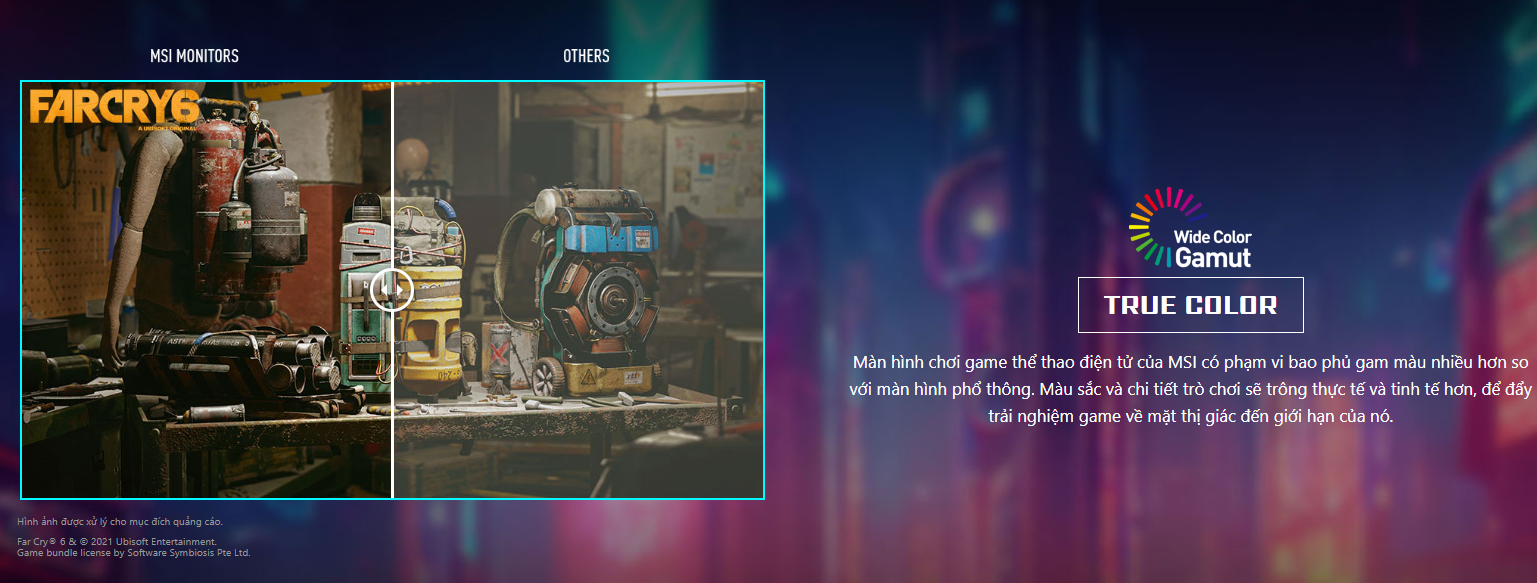 MSI G244F không chỉ tập trung vào tốc độ. Màn hình sở hữu độ phủ màu ấn tượng với dải màu rộng, giúp hình ảnh trong game rực rỡ và chân thực. Đây là điểm cộng lớn cho những ai muốn kết hợp chơi game và giải trí đa phương tiện trên cùng một thiết bị.