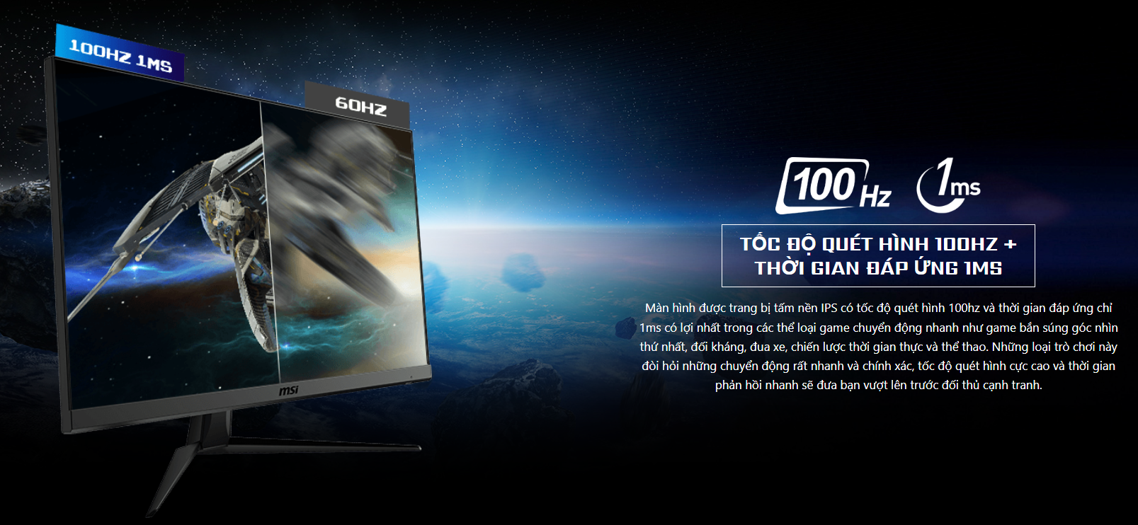 So với màn hình 60Hz thông thường, tần số quét 100Hz trên MSI G2712V giúp giảm thiểu hiện tượng mỏi mắt và mang lại khung hình chuyển động trơn tru hơn rõ rệt. Dù bạn đang cuộn trang web dài hay tham gia vào các trận chiến trong game, mọi thứ đều diễn ra mượt mà và nhạy bén.
