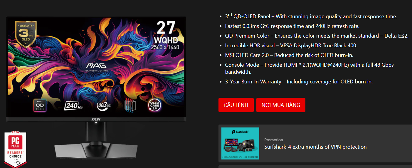Màn hình MSI MAG 271QPX QD-OLED E2 là minh chứng cho kỷ nguyên hiển thị mới. Nếu bạn muốn trải nghiệm những gì tinh túy nhất của công nghệ màn hình hiện nay—từ sắc đen của OLED đến tốc độ của màn hình gaming chuyên nghiệp—thì đây chính là sự lựa chọn không thể thay thế.