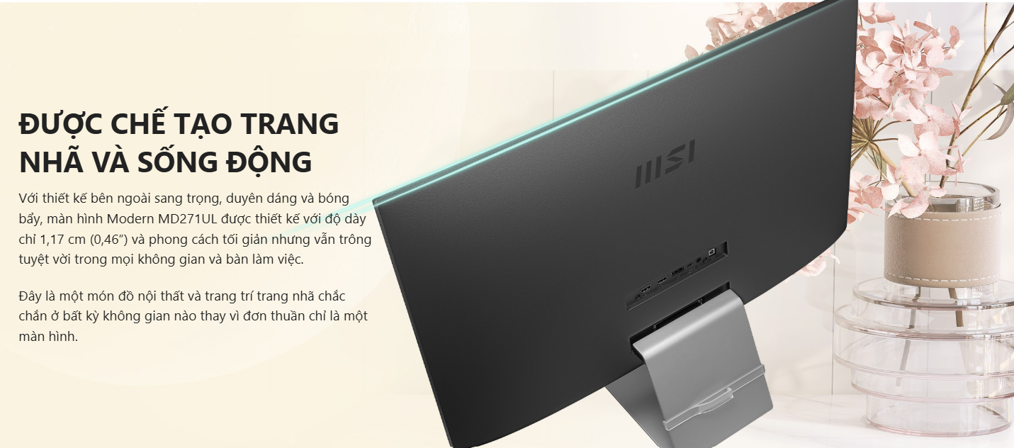 Sản phẩm sở hữu mặt lưng cong tối giản và chân đế hợp kim nhôm thanh mảnh nhưng vô cùng chắc chắn. Với độ mỏng ấn tượng, MD271UL không chỉ tiết kiệm diện tích mà còn biến góc làm việc của bạn trở nên sang trọng như một phòng trưng bày nghệ thuật.