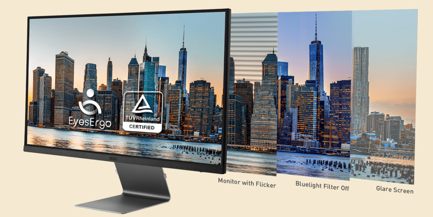 Bên cạnh công nghệ chống nhấp nháy và giảm ánh sáng xanh, MSI còn tích hợp hệ thống kiểm tra sức khỏe mắt (Eye-Q Check) độc quyền. Tính năng này giúp bạn tự kiểm tra tình trạng mỏi mắt và độ tập trung, nhắc nhở bạn nghỉ ngơi đúng lúc để bảo vệ thị lực về lâu dài.