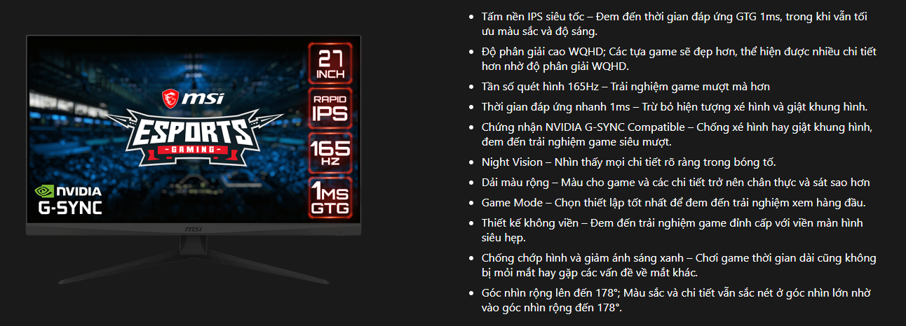 Công nghệ hỗ trợ: G-Sync Compatible, Night Vision, Game Mode.