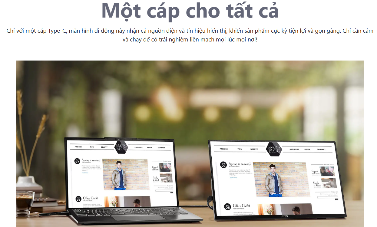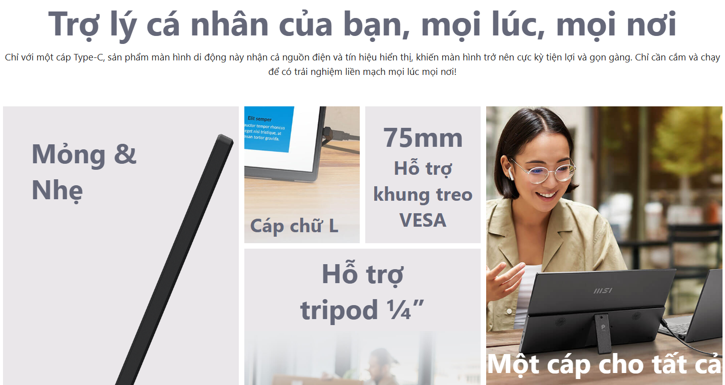 Sản phẩm cho phép truyền tải tín hiệu video và cấp nguồn đồng thời chỉ thông qua một sợi cáp USB Type-C duy nhất. Bên cạnh đó, Màn hình di động MSI PRO MP165 E6 vẫn trang bị cổng Mini-HDMI, đảm bảo khả năng tương thích linh hoạt với Laptop, máy tính bảng, điện thoại và các thiết bị console chơi game.