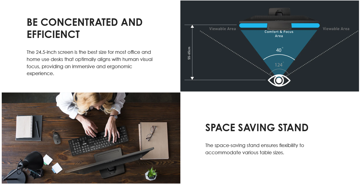Thay vì 24 inch thông thường, MSI PRO MP251 sở hữu kích thước 24.5 inch. Đây là diện tích hiển thị tối ưu giúp bạn quan sát toàn bộ nội dung mà không cần đảo mắt quá nhiều, đồng thời tiết kiệm không gian bàn làm việc nhưng vẫn mang lại cảm giác rộng rãi, thoải mái hơn.