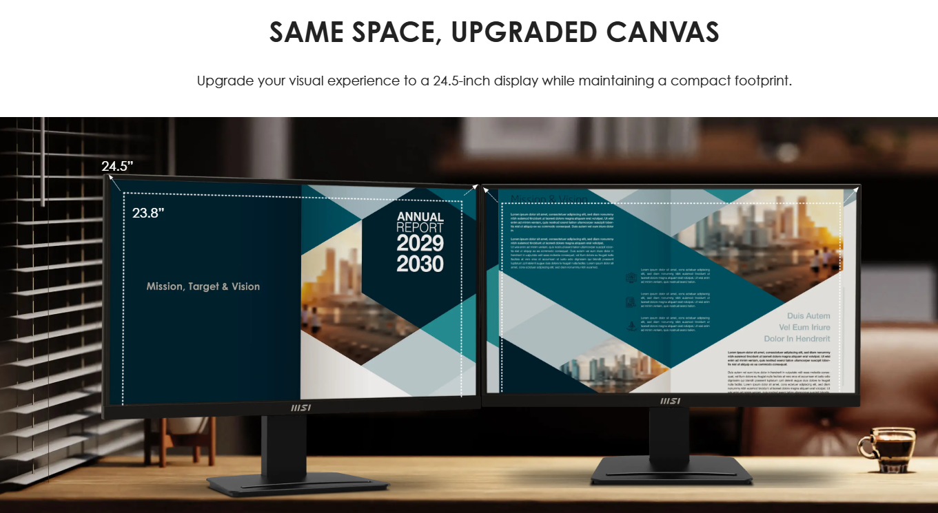 Thay vì 23.8 inch như các dòng cũ, MSI PRO MP253 mở rộng không gian lên 24.5 inch. Sự gia tăng này giúp bạn quan sát được nhiều dữ liệu hơn trên bảng tính, các dòng mã nguồn hay văn bản mà không làm thay đổi đáng kể kích thước tổng thể của màn hình, giữ cho góc làm việc luôn ngăn nắp.