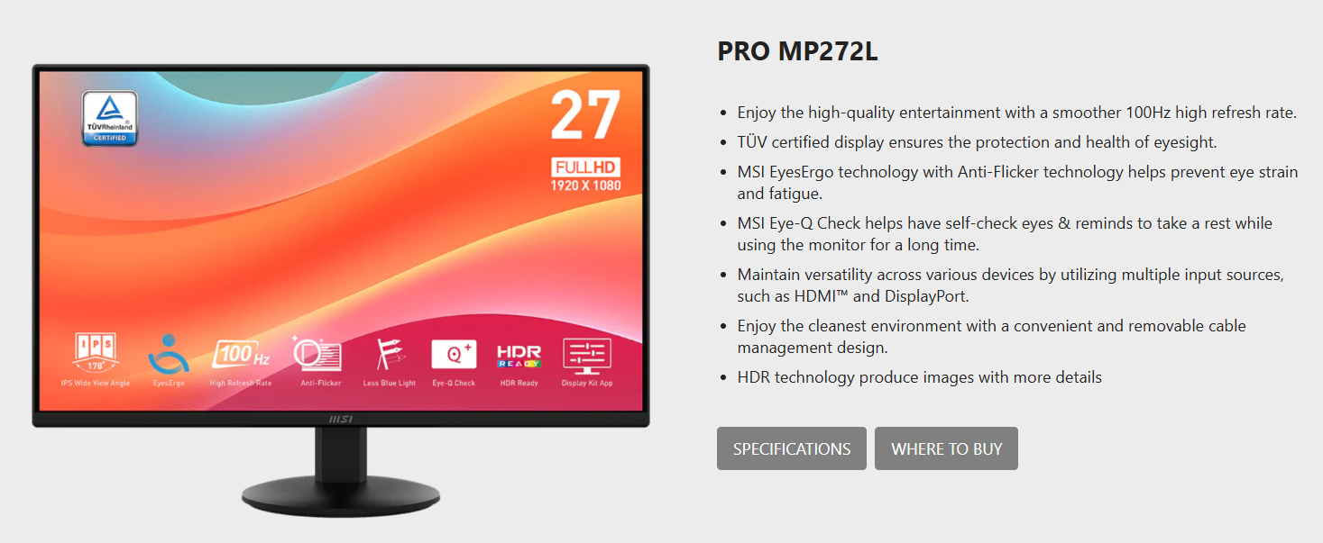 Màn hình MSI PRO MP272L (27 inch/100Hz/FHD/IPS)
