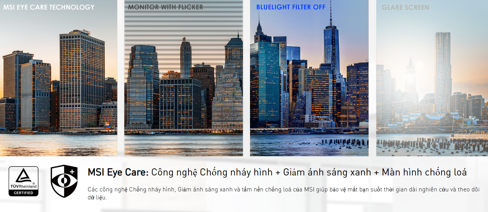 MSI trang bị bộ giải pháp bảo vệ mắt đạt chứng chỉ TÜV, bao gồm: chống nhấp nháy (Anti-Flicker), giảm ánh sáng xanh độc hại và lớp phủ chống chói (Anti-Glare). Các tính năng này giúp loại bỏ tình trạng khô mắt, nhức mỏi và đau đầu khi bạn phải làm việc tập trung trong thời gian dài.