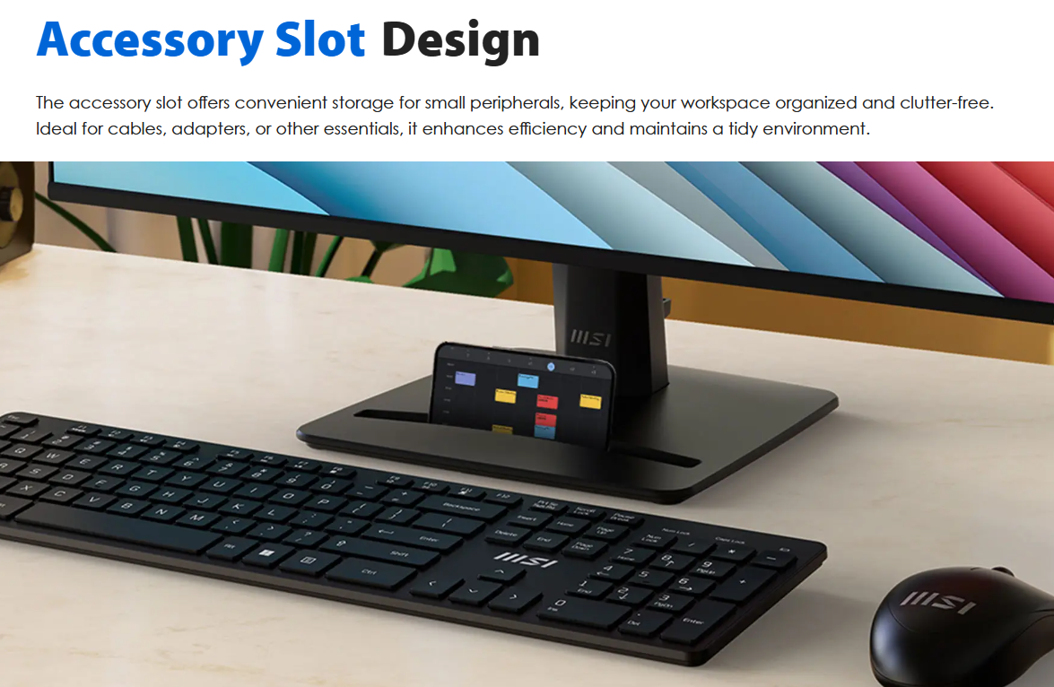 MSI đã tinh chỉnh chân đế của PRO MP275 E2 để trở nên đa năng hơn với một khe cắm điện thoại tích hợp. Thiết kế này giúp bạn dễ dàng theo dõi các thông báo quan trọng trên smartphone mà không làm xao nhãng công việc chính, đồng thời giữ cho mặt bàn luôn gọn gàng.