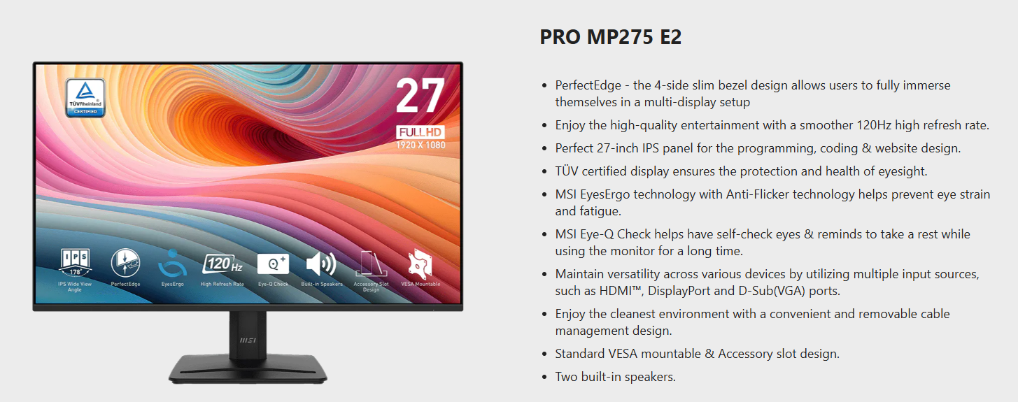 Màn hình MSI PRO MP275 E2 (27 inch/120Hz/FHD/IPS/Loa)