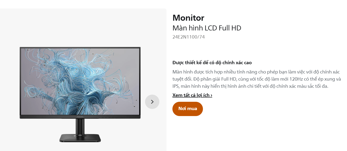 Màn hình Philips 24E2N1100/74 là dòng sản phẩm mới thuộc phân khúc phổ thông nhưng sở hữu những thông số ấn tượng, phù hợp cho cả nhu cầu giải trí và làm việc chuyên nghiệp. Với tấm nền IPS cao cấp, sản phẩm mang đến khả năng tái tạo màu sắc rực rỡ và góc nhìn rộng giúp bạn tận hưởng hình ảnh chất lượng từ mọi vị trí. Màn hình Philips 24E2N1100/74 còn được nâng cấp tần số quét lên 120Hz, mang lại sự mượt mà tuyệt đối trong các chuyển động đồ họa và thao tác chuột hàng ngày. Đây thực sự là giải pháp hiển thị toàn diện cho không gian làm việc hiện đại của bạn.