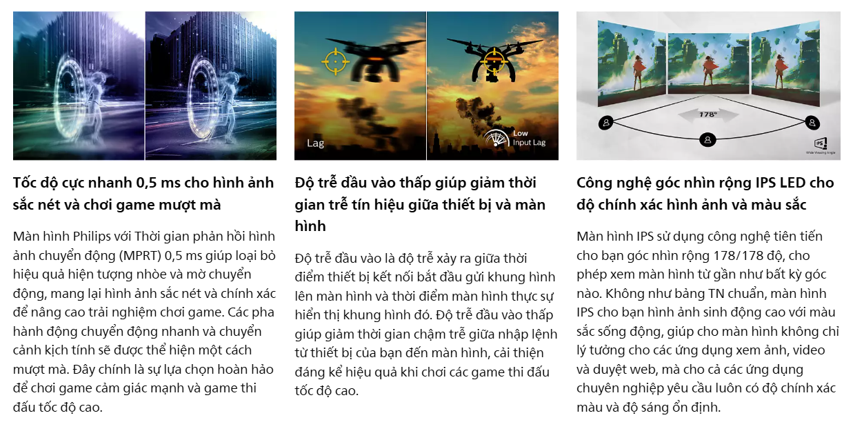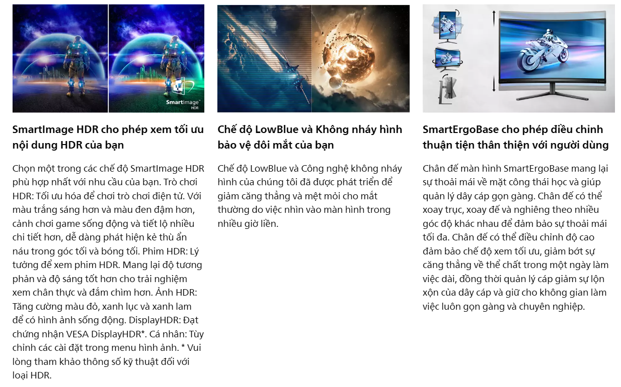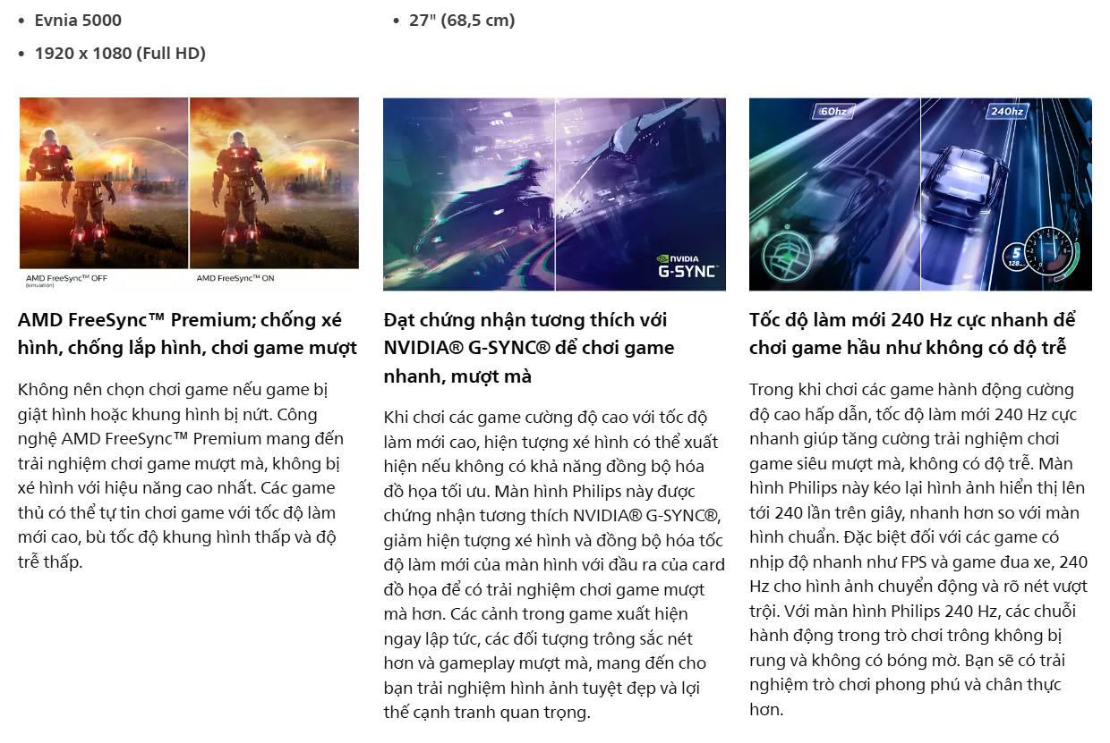 Tính năng: NVIDIA G-SYNC Compatible, AMD FreeSync Premium, HDR, SmartImage Game.