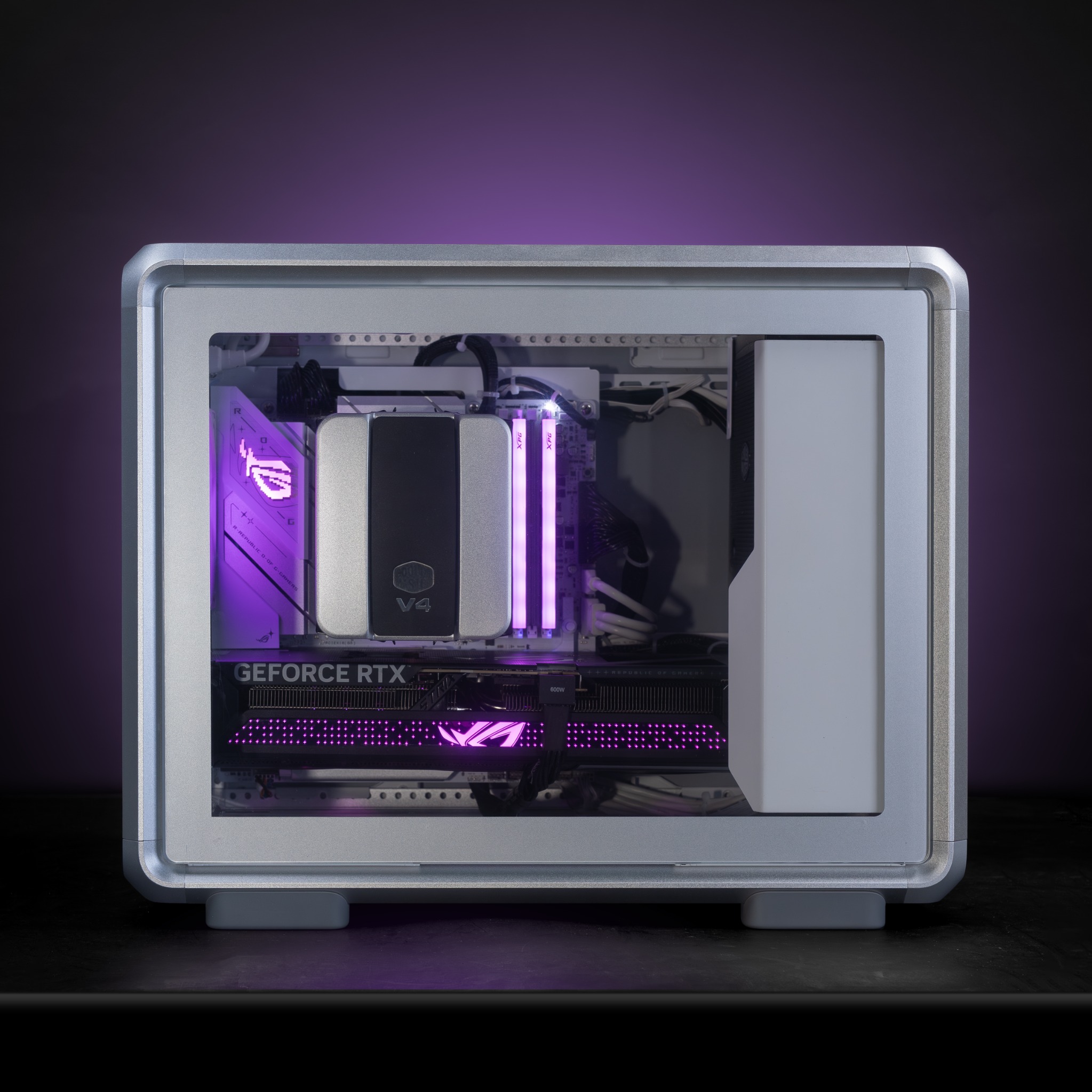 Đúng như tên gọi, Argent Monolith nổi bật với vỏ case Masterframe 400 Silver được hoàn thiện bề mặt nhám bạc tinh xảo. Thiết kế hình hộp vuông vức nhưng thanh thoát, kết hợp với các đường cắt CNC sắc sảo tạo nên một thực thể công nghệ đầy lôi cuốn. Hệ thống đèn RGB tím huyền ảo từ linh kiện bên trong hắt ra qua lớp kính cường lực giúp bộ máy trông như một khối năng lượng đang rực cháy.