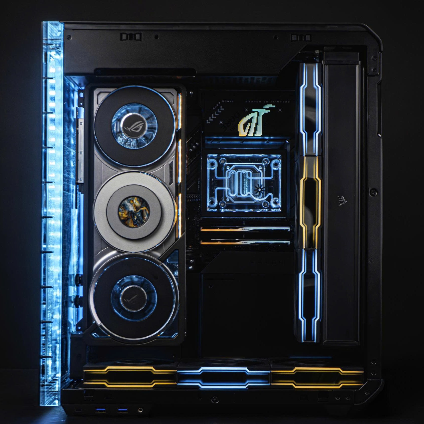 Hệ thống quạt Lian Li TL LCD Wireless Black không chỉ cung cấp luồng khí tối ưu mà còn tích hợp màn hình LCD hiển thị thông số hoặc hiệu ứng, tăng thêm tính thẩm mỹ cao cấp. Nguồn Asus TUF Gaming 1000W Gold Plus (ATX 3.0, PCI 5.0) đảm bảo cung cấp điện năng an toàn, ổn định và đủ công suất cho toàn bộ hệ thống cao cấp này.