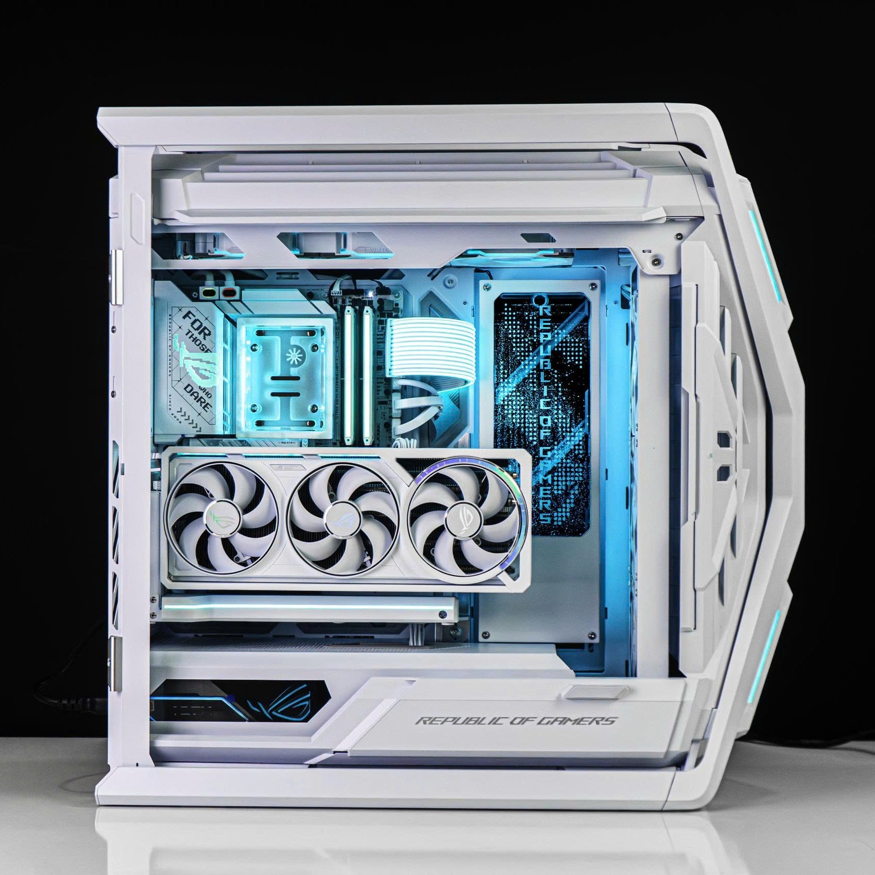 ROG Iceborne khoác lên mình "bộ giáp" khổng lồ Asus ROG Hyperion GR701 White Edition. Mọi chi tiết từ Mainboard Strix X870-A, card đồ họa ROG Astral White đến bộ nhớ Corsair Dominator Titanium đều được tuyển chọn tone-sur-tone trắng tinh khiết. Hệ thống đèn LED được tinh chỉnh tông màu xanh băng (Ice Blue), mang lại hiệu ứng thị giác cực kỳ sang trọng và mát lạnh.