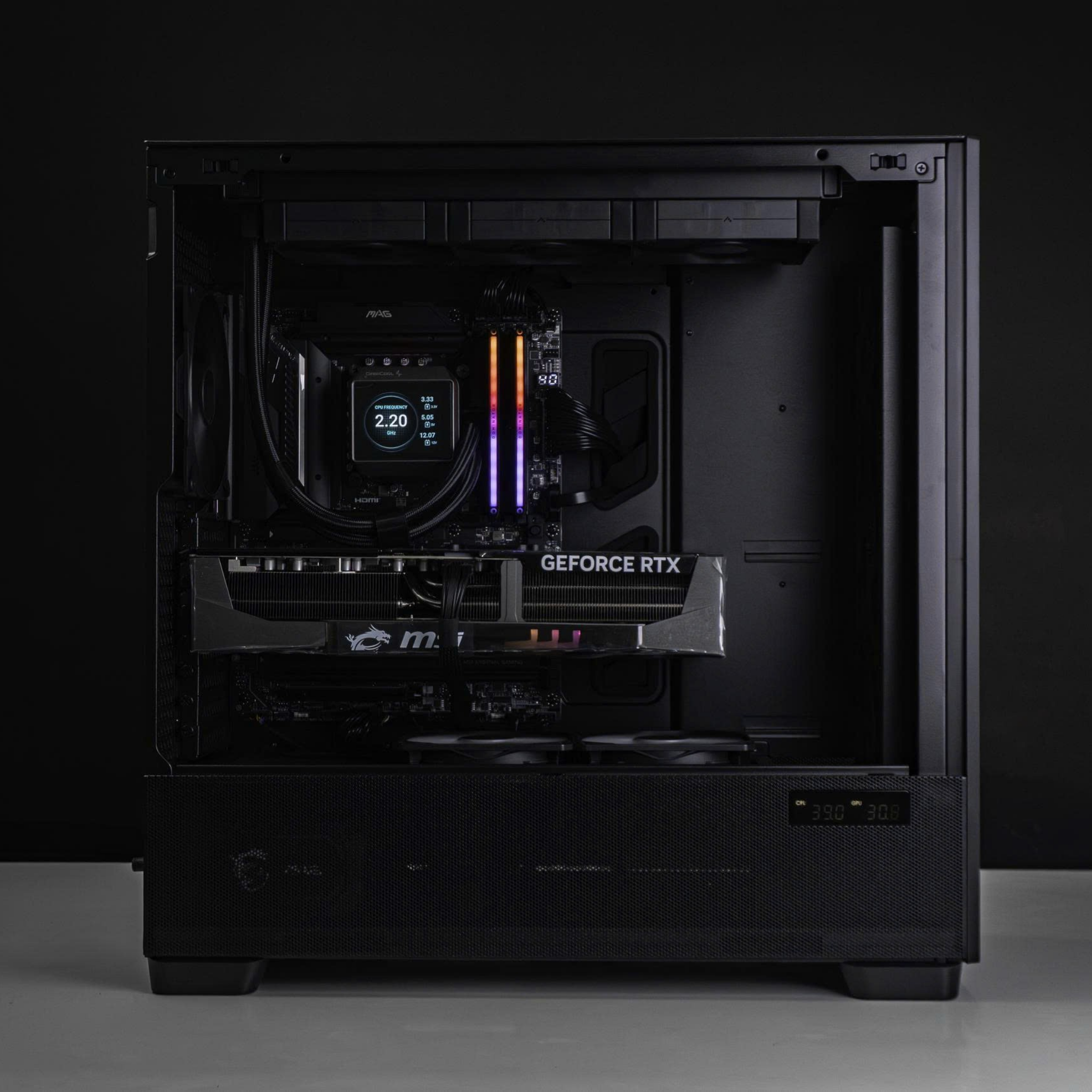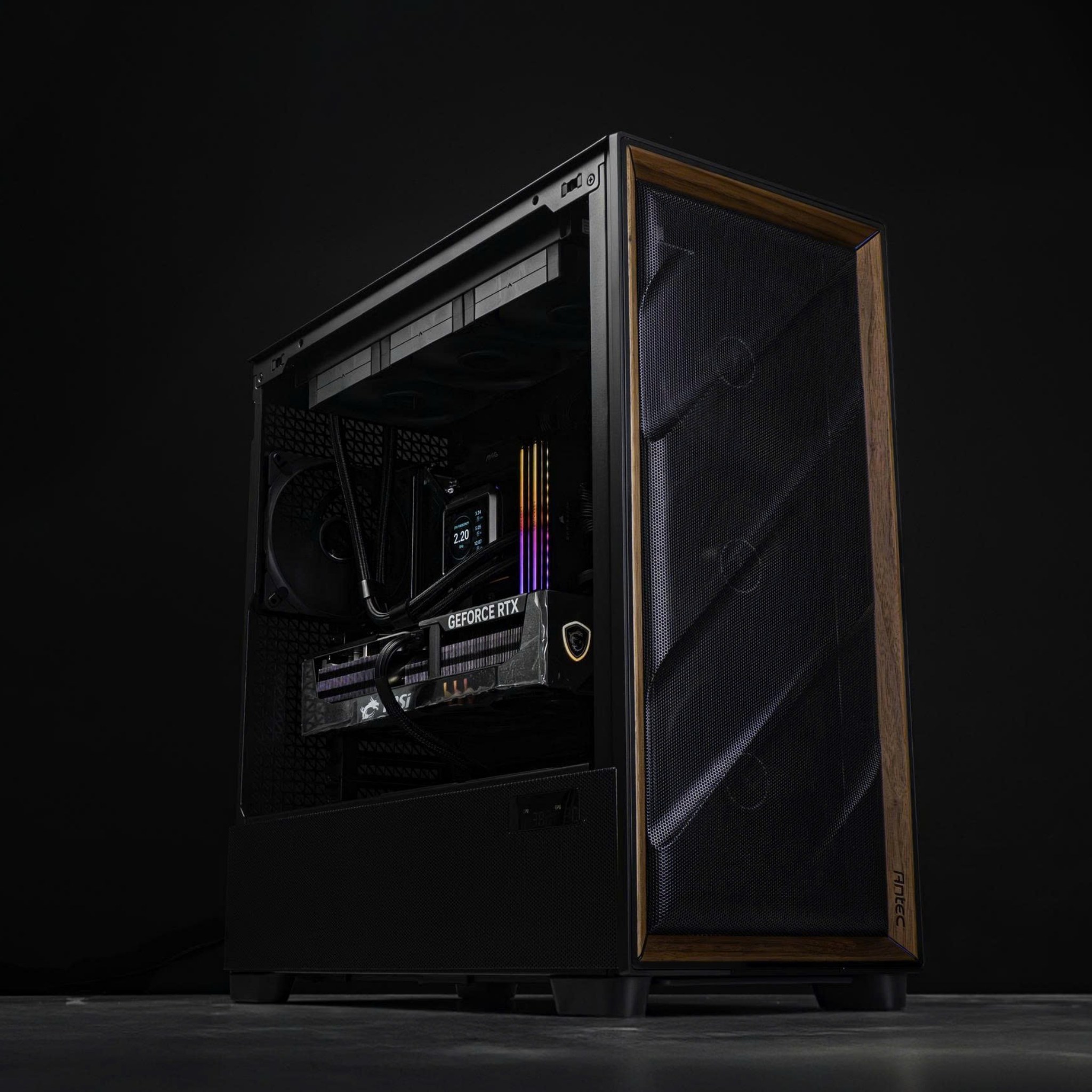 - Ngoại Hình - "Quái Vật" Lịch Lãm Ẩn Mình The Behemoth khoác lên mình "bộ giáp" ANTEC FLUX PRO Black, một khối monolith đen tuyền đầy uy lực, được thiết kế với triết lý tối ưu luồng gió (Flow Logic Unx). Vẻ ngoài tối giản nhưng mạnh mẽ này che giấu một "nội tại" được sắp đặt tinh xảo: bo mạch chủ MSI MAG Z890 TOMAHAWK với tông màu đen quân sự, cặp RAM Corsair Dominator Titanium cao cấp tỏa sáng rực rỡ, và tâm điểm là màn hình LCD tùy biến trên tản nhiệt Deepcool Mystique 360. Tất cả tạo nên một cỗ máy có vẻ ngoài vừa lịch lãm, vừa bí ẩn, như một con quái vật đang chờ thời cơ để giải phóng sức mạnh.