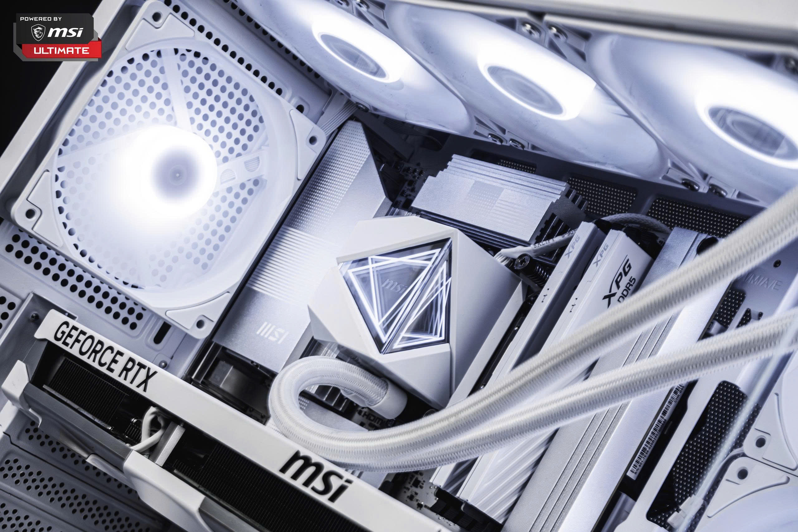 Để đảm bảo hiệu năng ổn định, MSI Frost được trang bị tản nhiệt nước MAG CORELIQUID I360 WHITE. Hệ thống tản nhiệt 3 quạt không chỉ giữ cho CPU Intel Core Ultra 7 luôn mát mẻ dưới tải nặng mà còn là điểm nhấn thẩm mỹ rực rỡ với tông màu trắng đồng bộ, giúp không gian máy trở nên chuyên nghiệp và bắt mắt hơn.