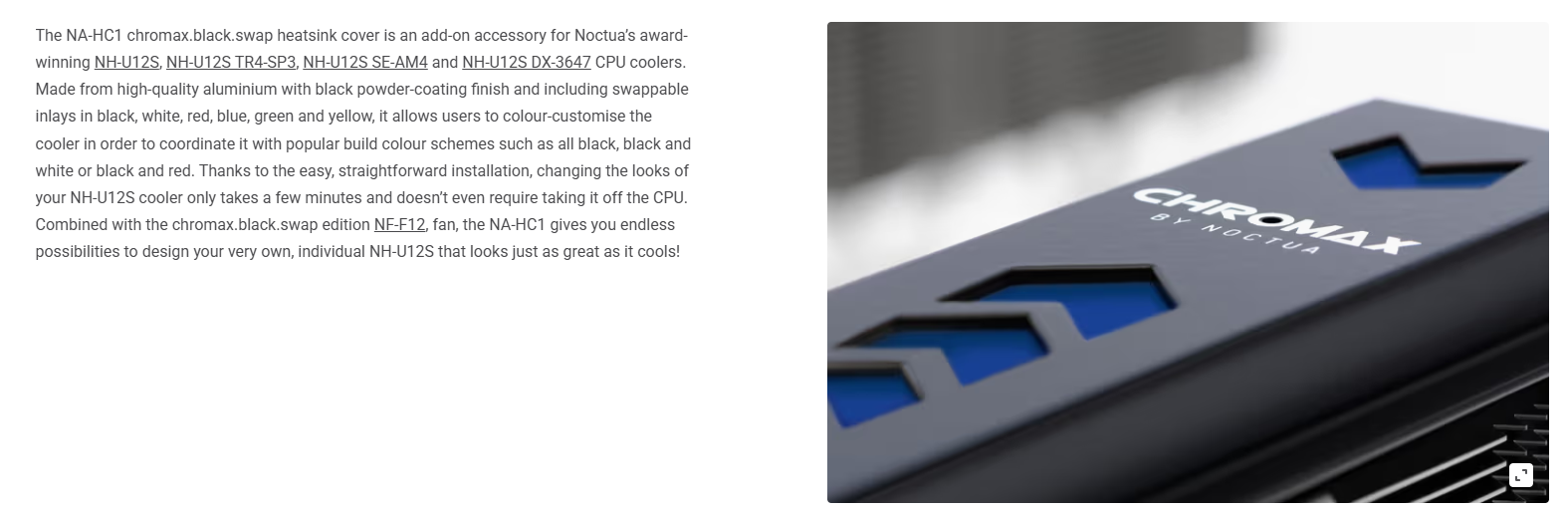 Nắp tản nhiệt Noctua NA-HC1 Chromax.black.swap là phụ kiện trang trí dành riêng cho các dòng tản nhiệt huyền thoại NH-U12S, NH-U12S TR4-SP3, NH-U12S SE-AM4 và NH-U12S DX-3647. Đây là giải pháp hoàn hảo cho những người dùng yêu thích hiệu năng của Noctua nhưng muốn bộ máy của mình có vẻ ngoài hiện đại, đồng bộ màu sắc. Với chất liệu nhôm cao cấp và khả năng thay đổi màu sắc linh hoạt, NA-HC1 giúp che đi các đầu ống đồng và lá nhôm, tạo nên một khối thống nhất, sang trọng bên trong vỏ case.