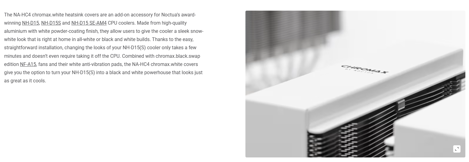 Nắp tản nhiệt Noctua NA-HC4 Chromax.white xóa bỏ định kiến rằng tản nhiệt khí khổng lồ thì không thể đẹp. Với chất liệu nhôm sang trọng và màu trắng tinh tế, đây là món phụ kiện "đáng đồng tiền bát gạo" để nâng tầm đẳng cấp cho bộ máy sử dụng NH-D15 của bạn.