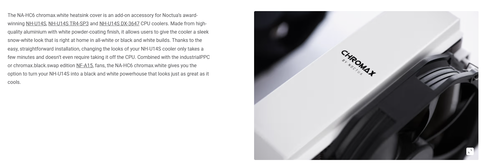 Khi kết hợp cùng quạt dòng Chromax hoặc các miếng đệm chống rung trắng, NA-HC6 giúp chiếc NH-U14S của bạn trở thành tâm điểm của hệ thống, đặc biệt là trong các thùng máy có mặt kính cường lực.