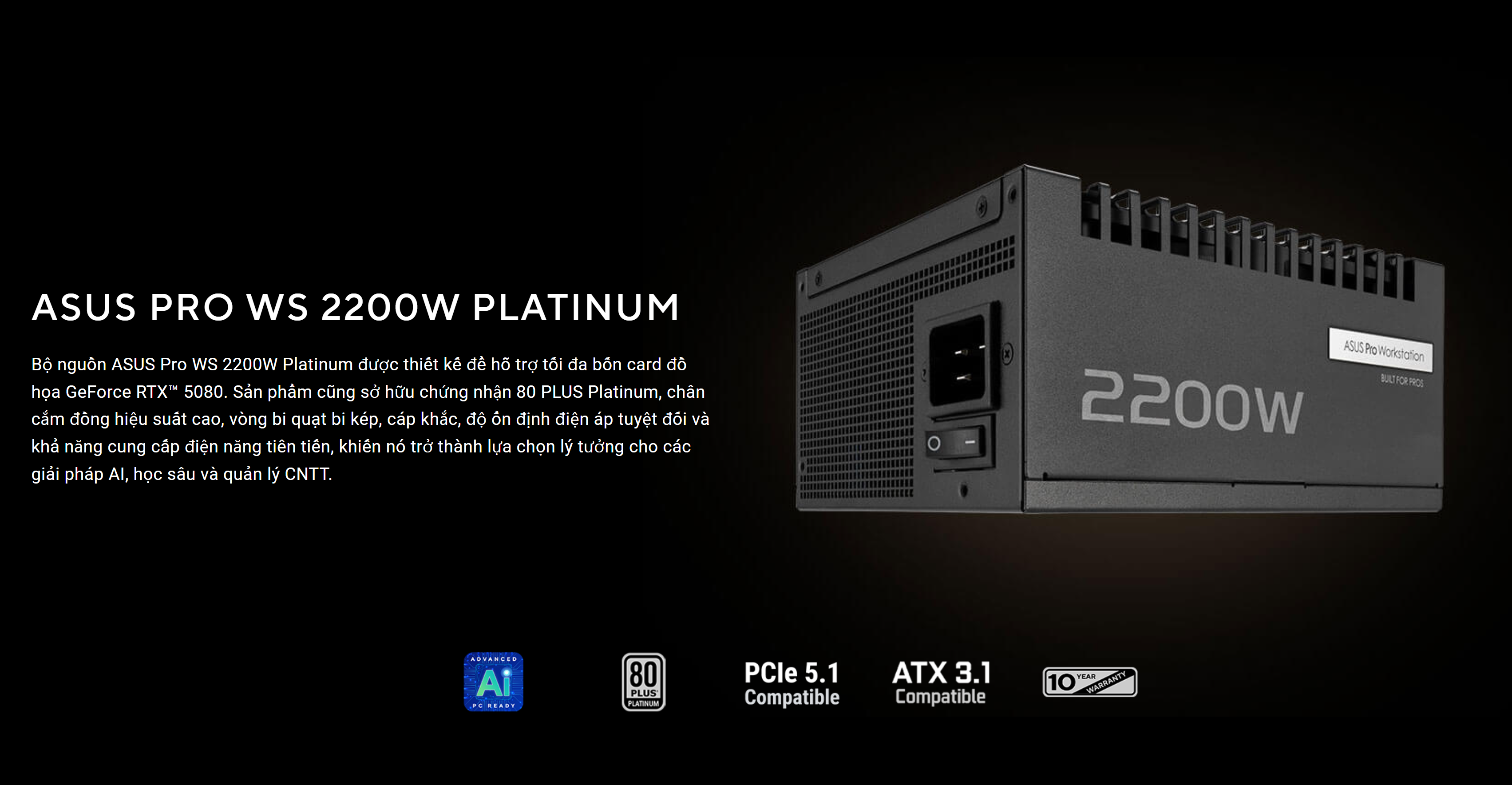 ASUS Pro WS 2200W Platinum không chỉ là một nguồn máy tính thông thường, mà là một giải pháp năng lượng chuyên dụng, được thiết kế để đáp ứng những thách thức lớn nhất của kỷ nguyên công nghệ hiện đại. Với công suất khổng lồ, hiệu suất vượt trội và độ tin cậy tuyệt đối, đây là sự lựa chọn hàng đầu để bảo vệ và tối ưu hóa hiệu năng cho các trạm làm việc chuyên nghiệp.