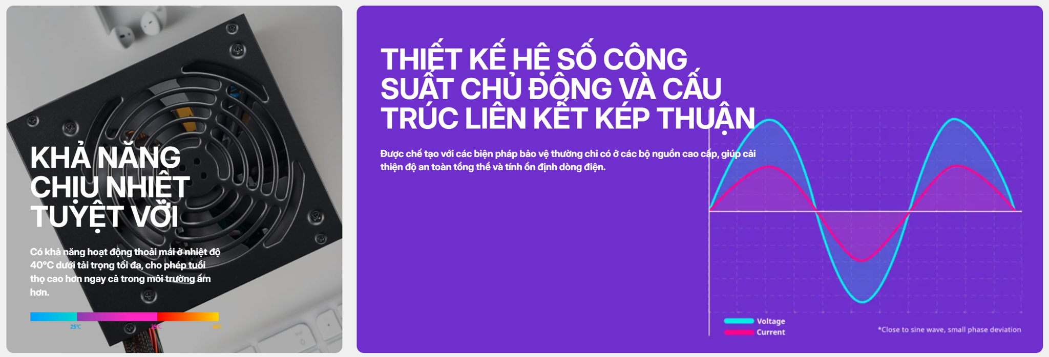 Sở hữu thiết kế Active PFC, nguồn mang lại dòng điện sạch và ổn định hơn. Cấu trúc đường Single +12V tập trung toàn bộ công suất để cung cấp năng lượng cho những linh kiện quan trọng nhất như CPU và VGA, giúp hệ thống luôn sẵn sàng xử lý các tác vụ nặng mà không lo sụt áp.