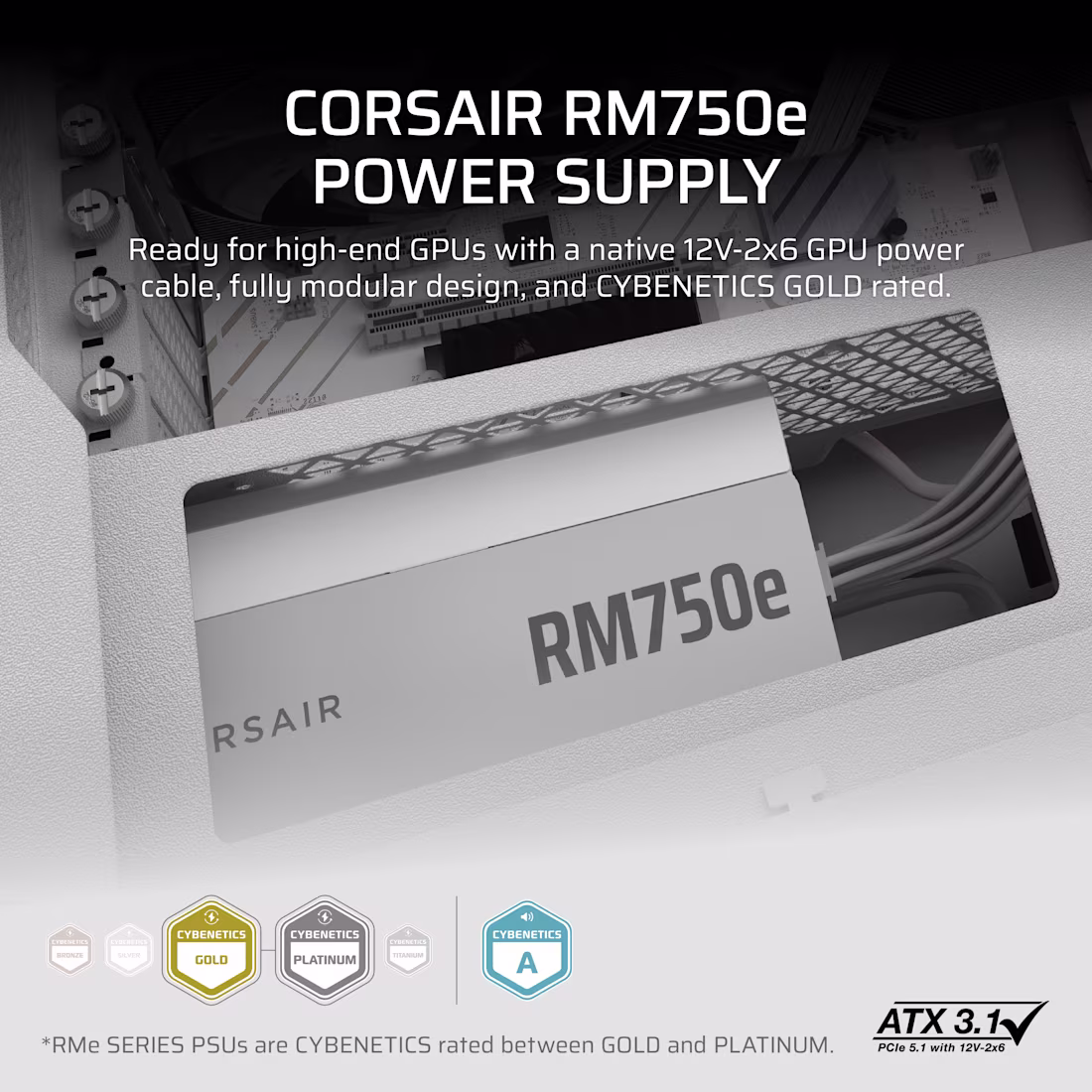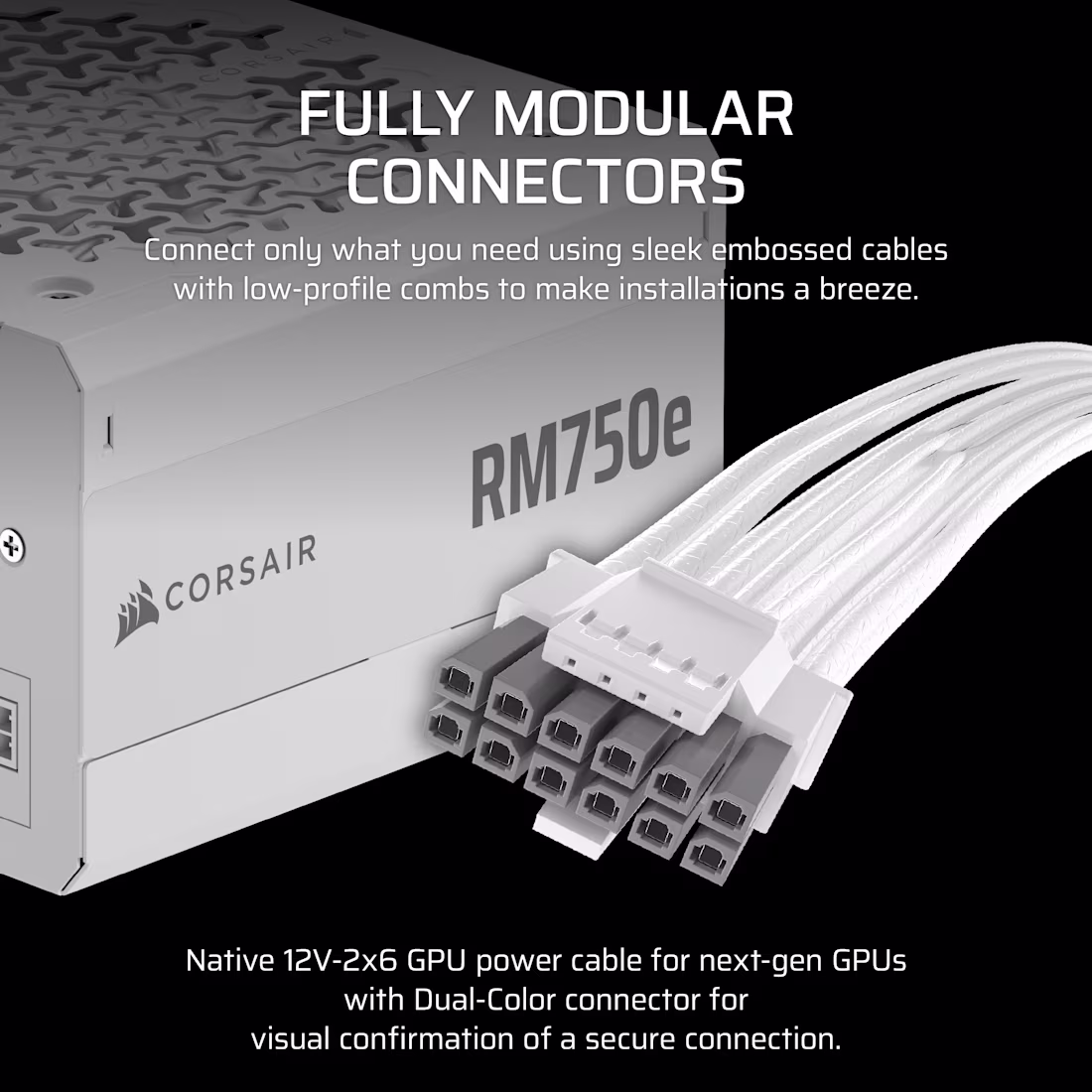 Hỗ trợ chuẩn ATX 3.1 & PCIe 5.1: RM750e được thiết kế để tương thích hoàn toàn với các linh kiện thế hệ mới nhất. Cáp 12V-2x6 đi kèm cung cấp công suất lên đến 600W, sẵn sàng cấp điện cho các card đồ họa cao cấp mà không cần adapter, đảm bảo hiệu suất và độ an toàn tối đa.