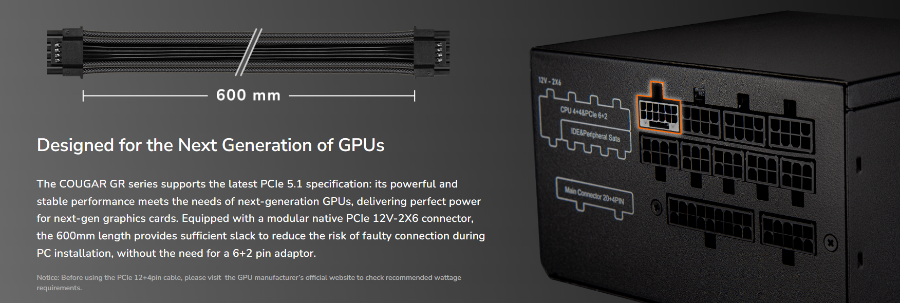 Nguồn Cougar GR 750 được xây dựng theo chuẩn ATX 3.1, mang lại sự tương thích hoàn hảo với các CPU đa nhân hiện tại và thế hệ tiếp theo. Với đầu nối 12V-2x6 tích hợp, nguồn hỗ trợ các Card đồ họa PCI Express 5.1 mới nhất, đảm bảo cung cấp điện năng mạnh mẽ và ổn định, đặc biệt là trong các tình huống yêu cầu công suất tăng đột biến.