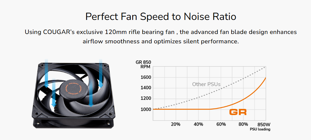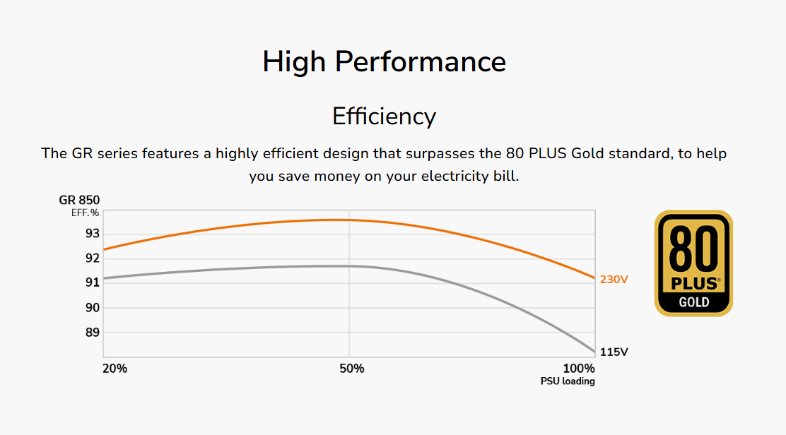 Đạt chứng nhận 80 PLUS Gold, bộ nguồn Cougar GR 750 đạt hiệu suất lên tới 91% trong điều kiện tải thông thường. Hiệu suất cao không chỉ giúp giảm lượng điện năng bị hao phí dưới dạng nhiệt, mà còn duy trì hiệu suất hoạt động hoàn hảo ngay cả ở nhiệt độ môi trường 40°C.