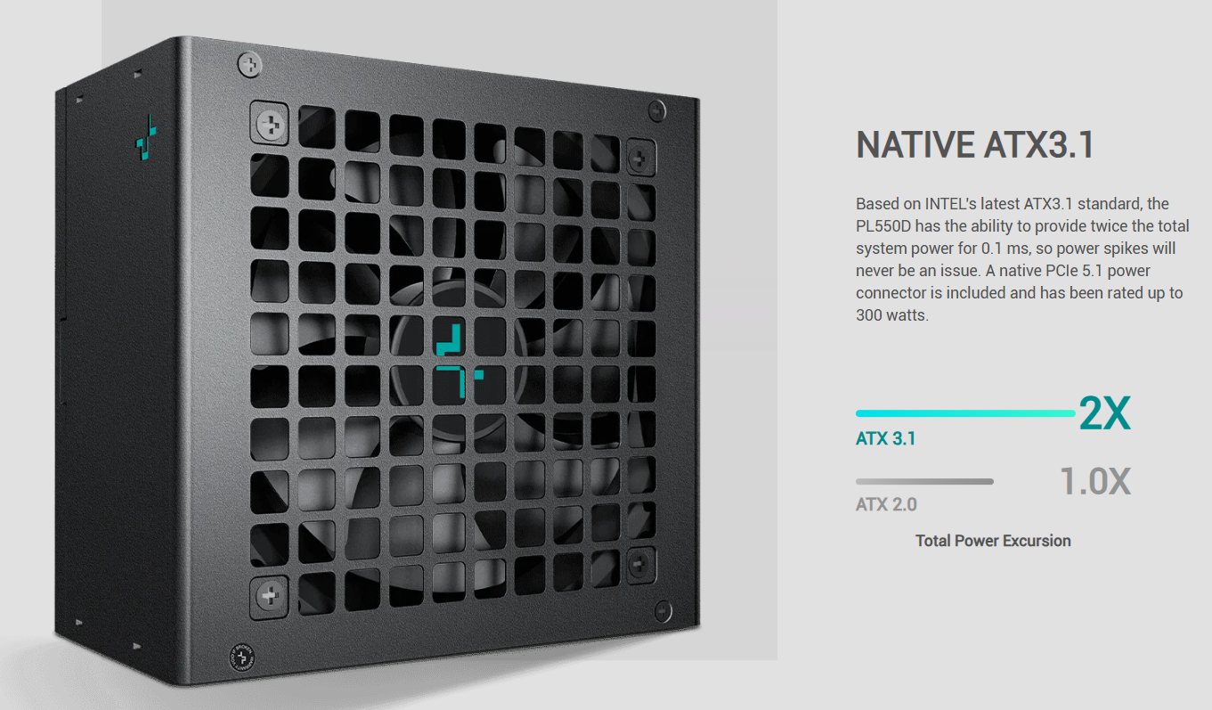 Nguồn máy tính DeepCool PL550D 550W đi đầu trong việc cập nhật tiêu chuẩn ATX 3.1 mới nhất, giúp cải thiện khả năng quản lý điện năng và độ ổn định của hệ thống. Sản phẩm được thiết kế để xử lý tốt các xung đột biến công suất từ các linh kiện thế hệ mới, đảm bảo máy tính luôn hoạt động mượt mà ngay cả khi tải nặng.