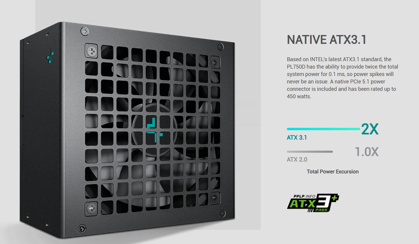 Nguồn máy tính DeepCool PL750D 750W đạt chứng nhận chuẩn ATX 3.1 mới nhất từ Intel, giúp hệ thống kiểm soát tốt các tình trạng đột biến điện năng (Power Spikes) từ linh kiện. Điều này cực kỳ quan trọng đối với các dòng Card đồ họa đời mới, giúp ngăn ngừa tình trạng sập nguồn đột ngột và bảo vệ an toàn cho toàn bộ dữ liệu của bạn.