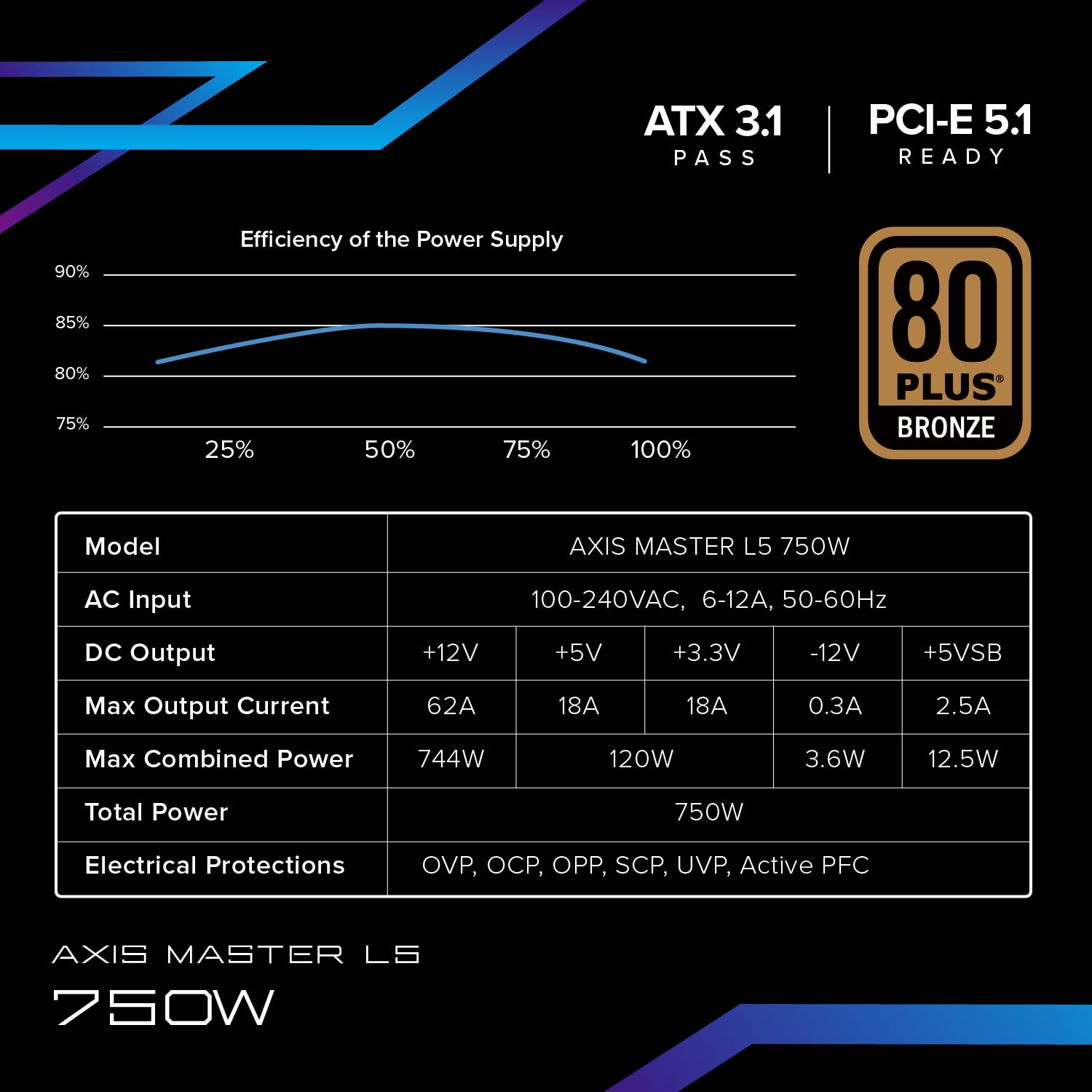 Sức mạnh ổn định, đơn giản: AXIS MASTER L5 được thiết kế để cung cấp nguồn điện ổn định, đảm bảo hệ thống của bạn hoạt động trơn tru. Với công suất 750W, nguồn này đủ sức gánh vác các bộ vi xử lý và card đồ họa mạnh mẽ, mang lại hiệu năng nhất quán mà không gặp vấn đề.