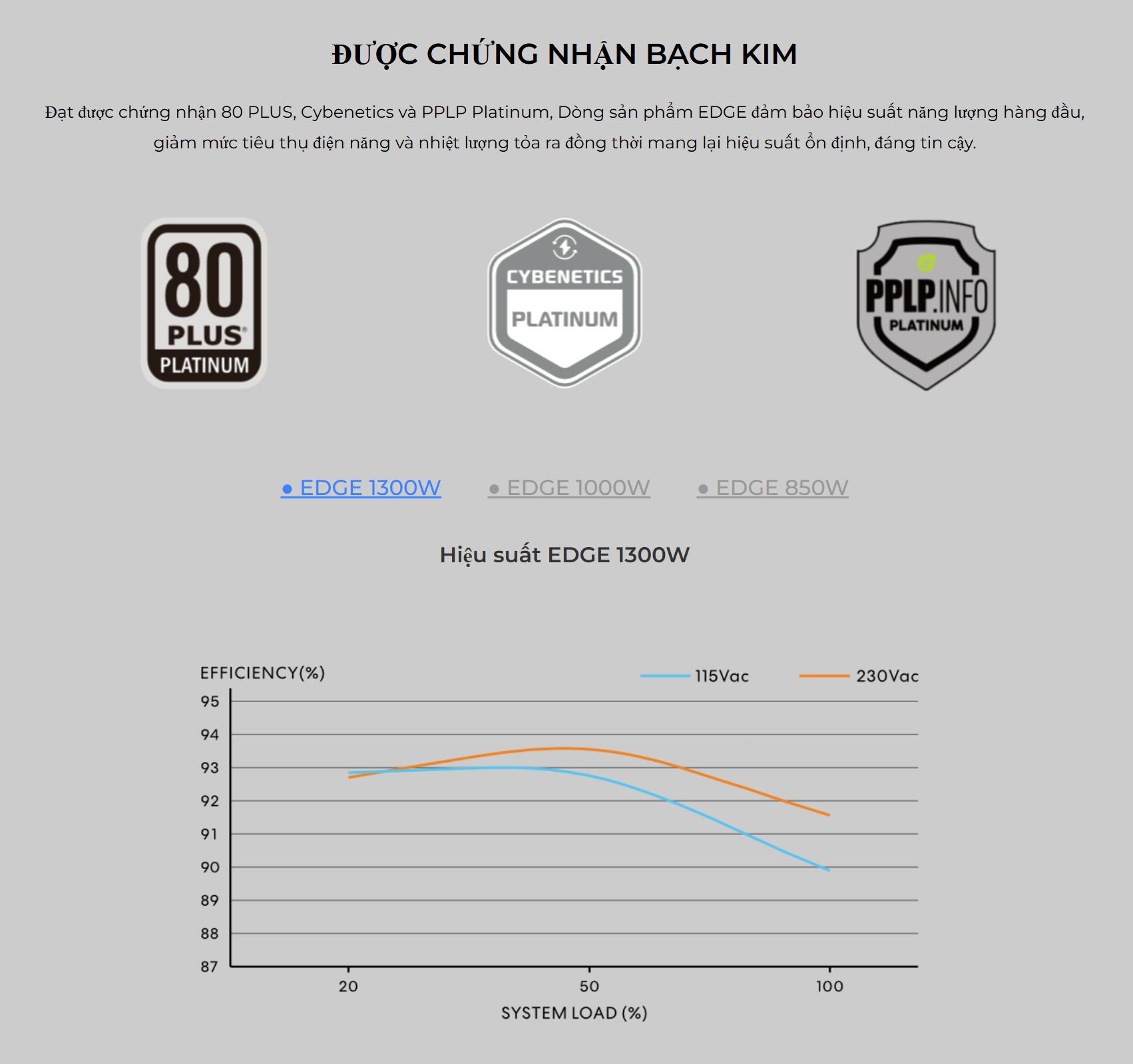 Nguồn đạt tới 3 chứng nhận Platinum bao gồm , Cybenetics PLATINUM và PPLP PLATINUM. Điều này đảm bảo hiệu suất năng lượng vượt ở tải , giúp giảm nhiệt lượng thất thoát và tiết kiệm điện năng đáng kể.