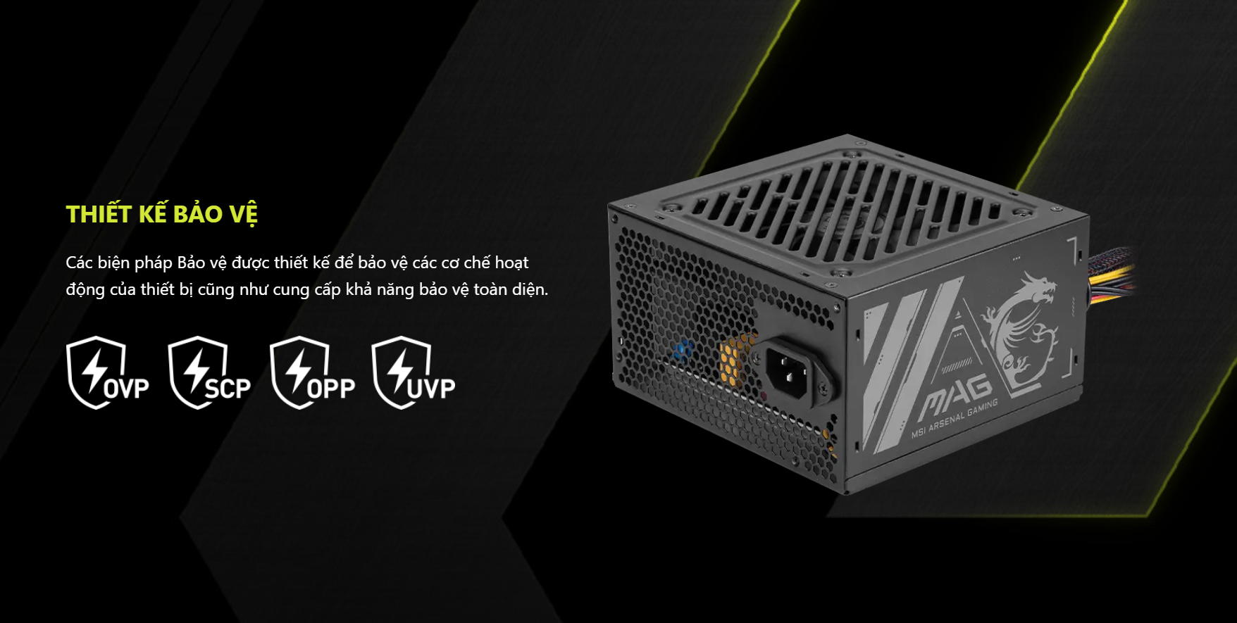 Đầy đủ các cơ chế bảo vệ: Bộ nguồn tích hợp các công nghệ bảo vệ quan trọng như OCP (Bảo vệ quá dòng), OPP (Bảo vệ quá công suất), SCP (Bảo vệ ngắn mạch), và UVP (Bảo vệ dưới điện áp). Các tính năng này giúp giảm thiểu rủi ro hư hỏng linh kiện do các sự cố về điện.