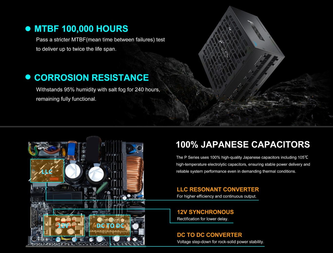 Khác với các dòng nguồn thông thường, Sama P1000 sử dụng toàn bộ tụ điện đến từ Nhật Bản. Điều này đảm bảo khả năng chịu nhiệt cực tốt (lên đến 105°C), lọc nhiễu tín hiệu điện sạch hơn và kéo dài tuổi thọ cho các linh kiện nhạy cảm như CPU và Mainboard.