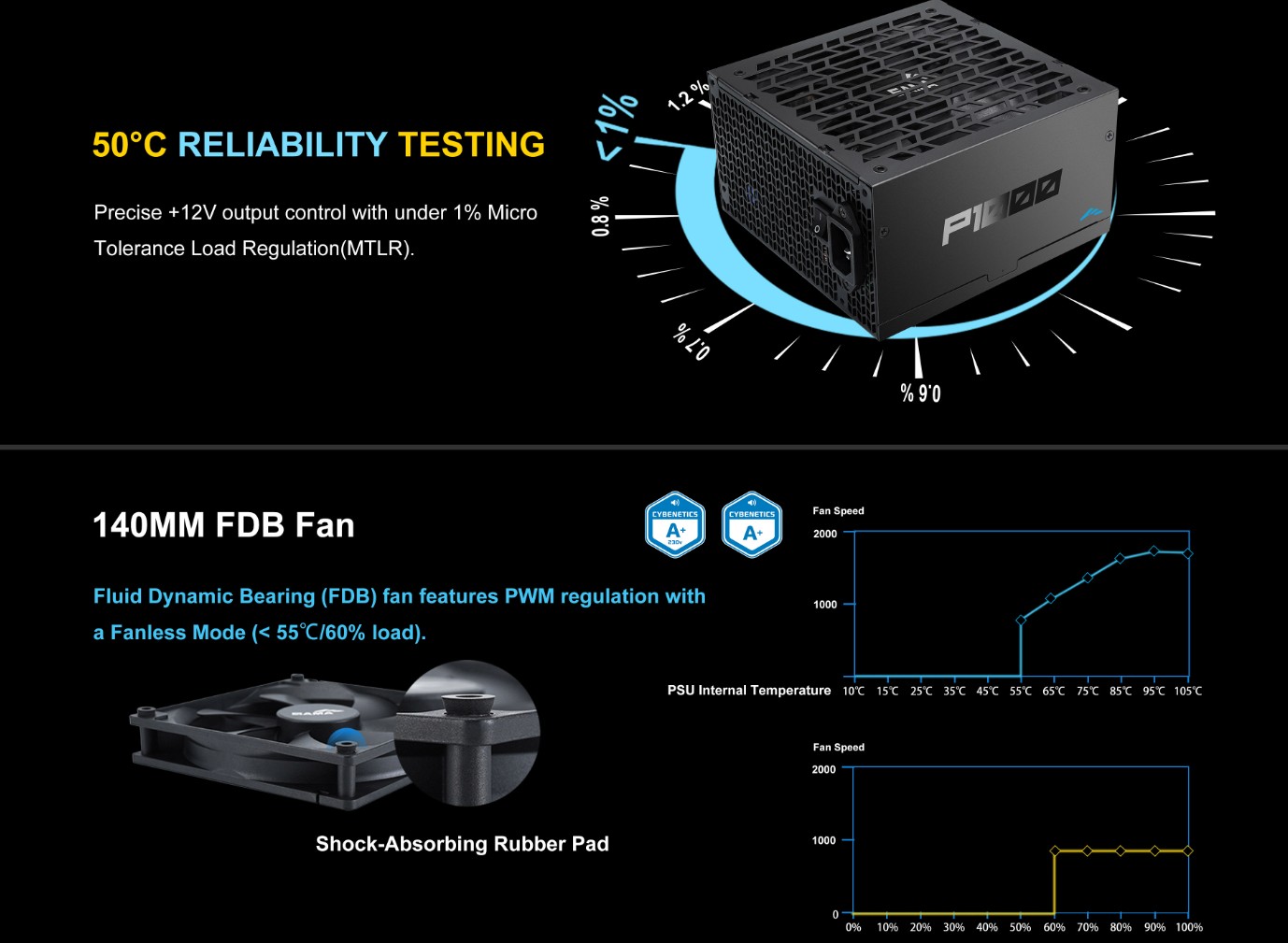 Sở hữu quạt 140mm kích thước lớn sử dụng vòng bi chất lỏng FDB, Sama P1000 có khả năng đẩy lượng gió khổng lồ để làm mát linh kiện bên trong mà gần như không phát ra tiếng động. Hệ thống bảo vệ 8 lớp (OTP, OCP, OPP, SCP, OVP, UVP, SIP, NLO) giúp bạn hoàn toàn yên tâm trước mọi biến cố về điện lưới.